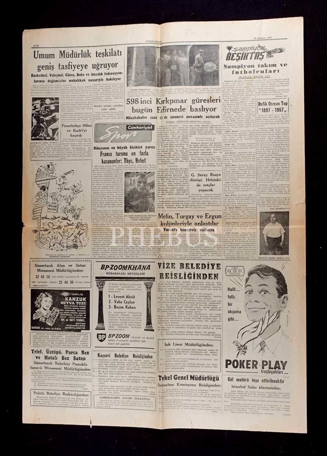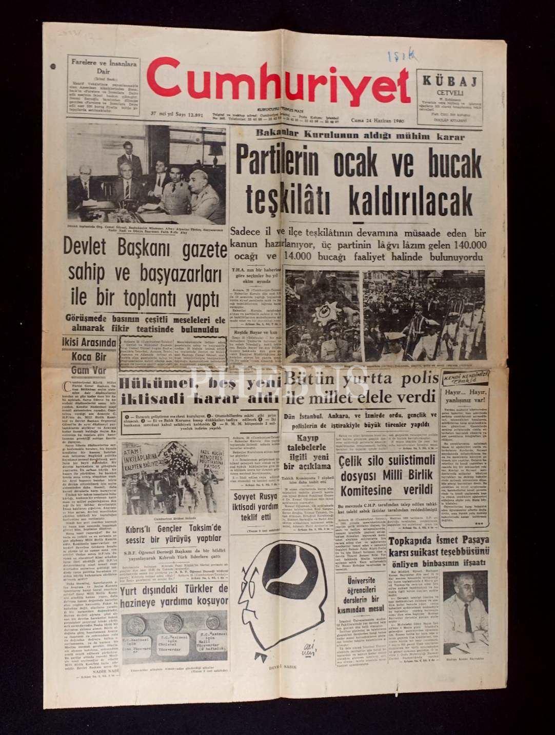 "Partilerin Ocak ve Bucak Teşkilâtı Kaldırılacak" manşetli Cumhuriyet gazetesi, 24 Haziran 1960 tarihli, 43x60 cm