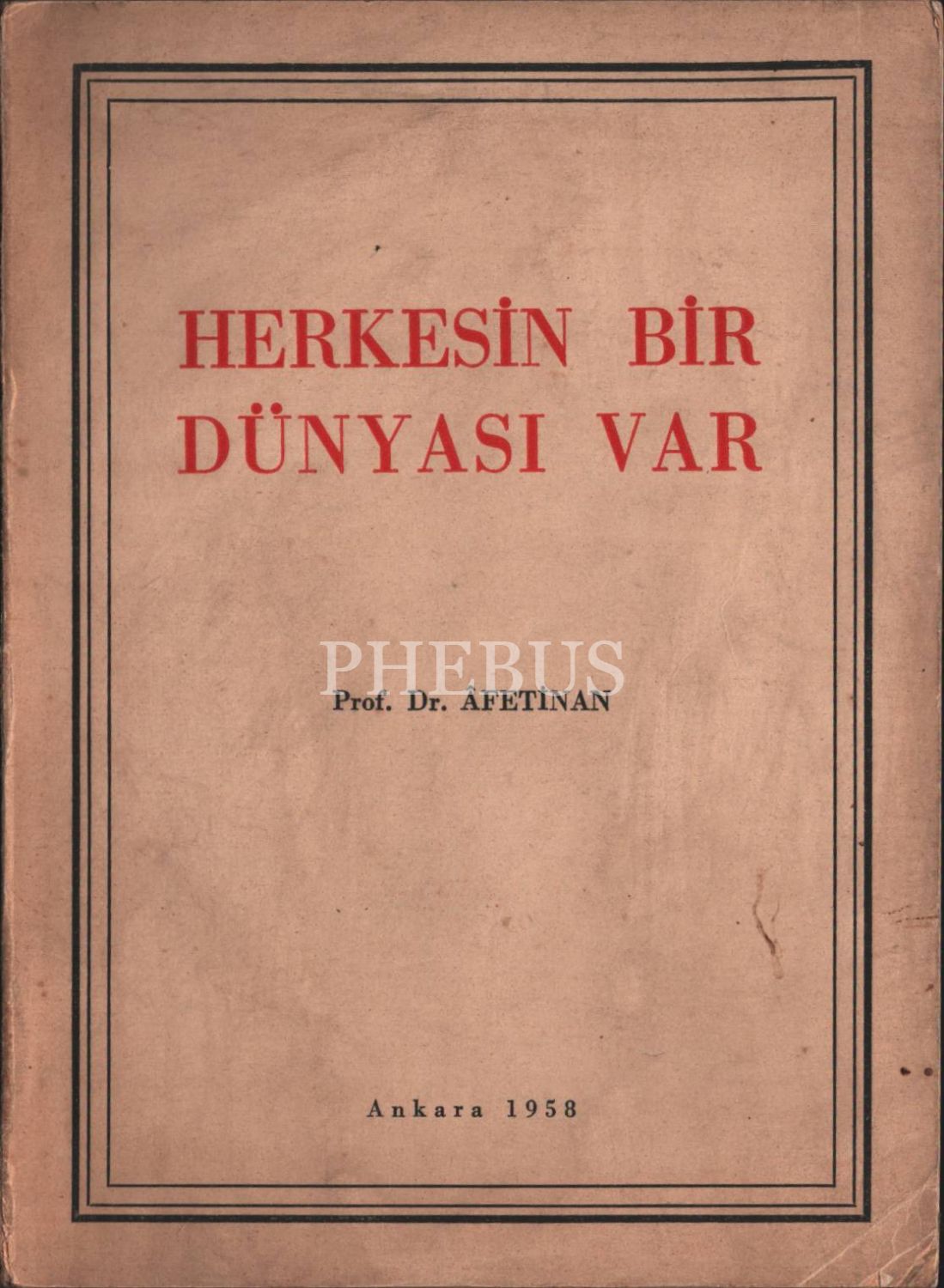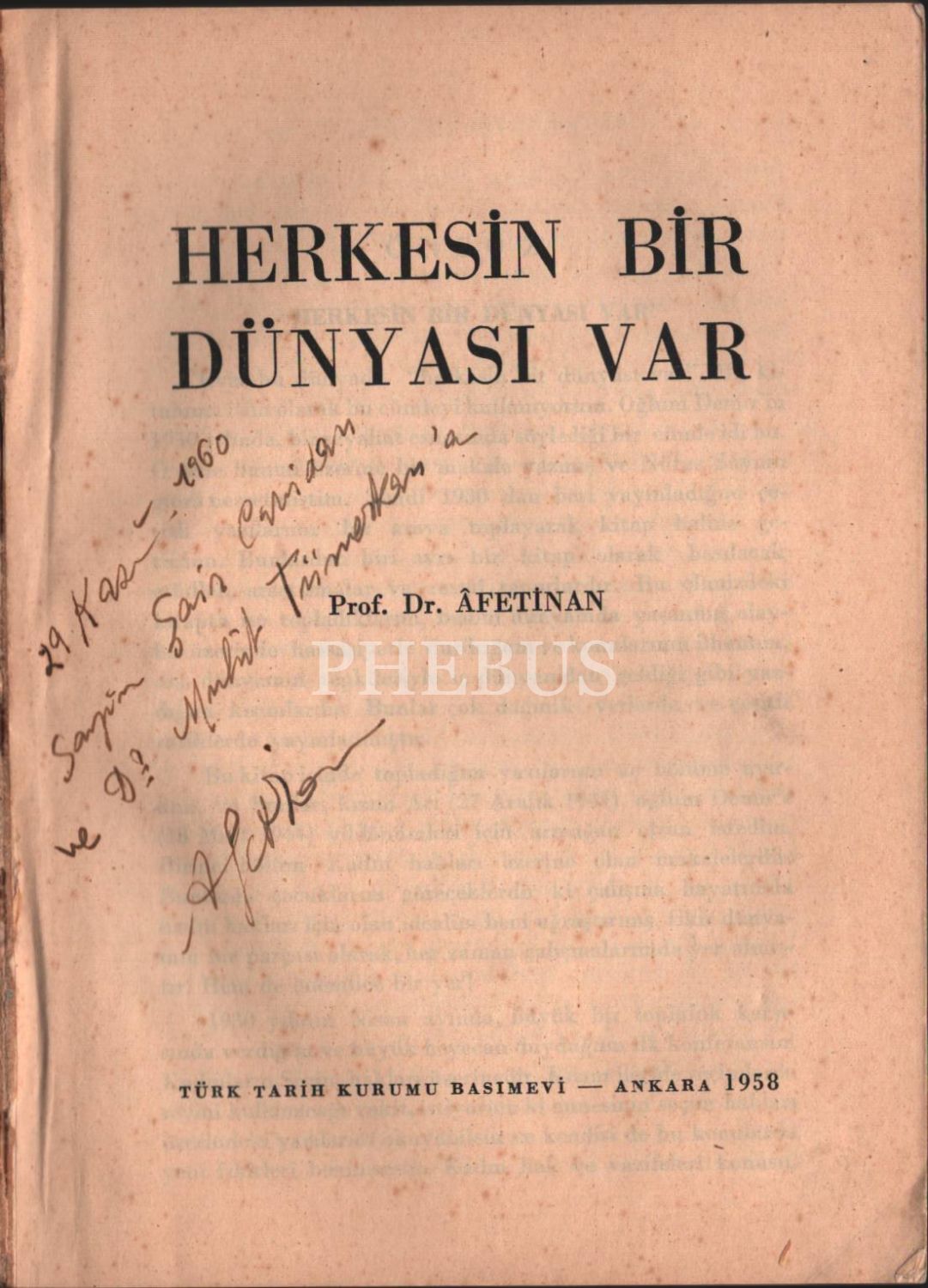 HERKESİN BİR DÜNYASI VAR, Âfet İnan'dan ithaflı ve imzalı, Ankara 1958, Türk Tarih Kurumu Basımevi, 191 sayfa, 14x19 cm