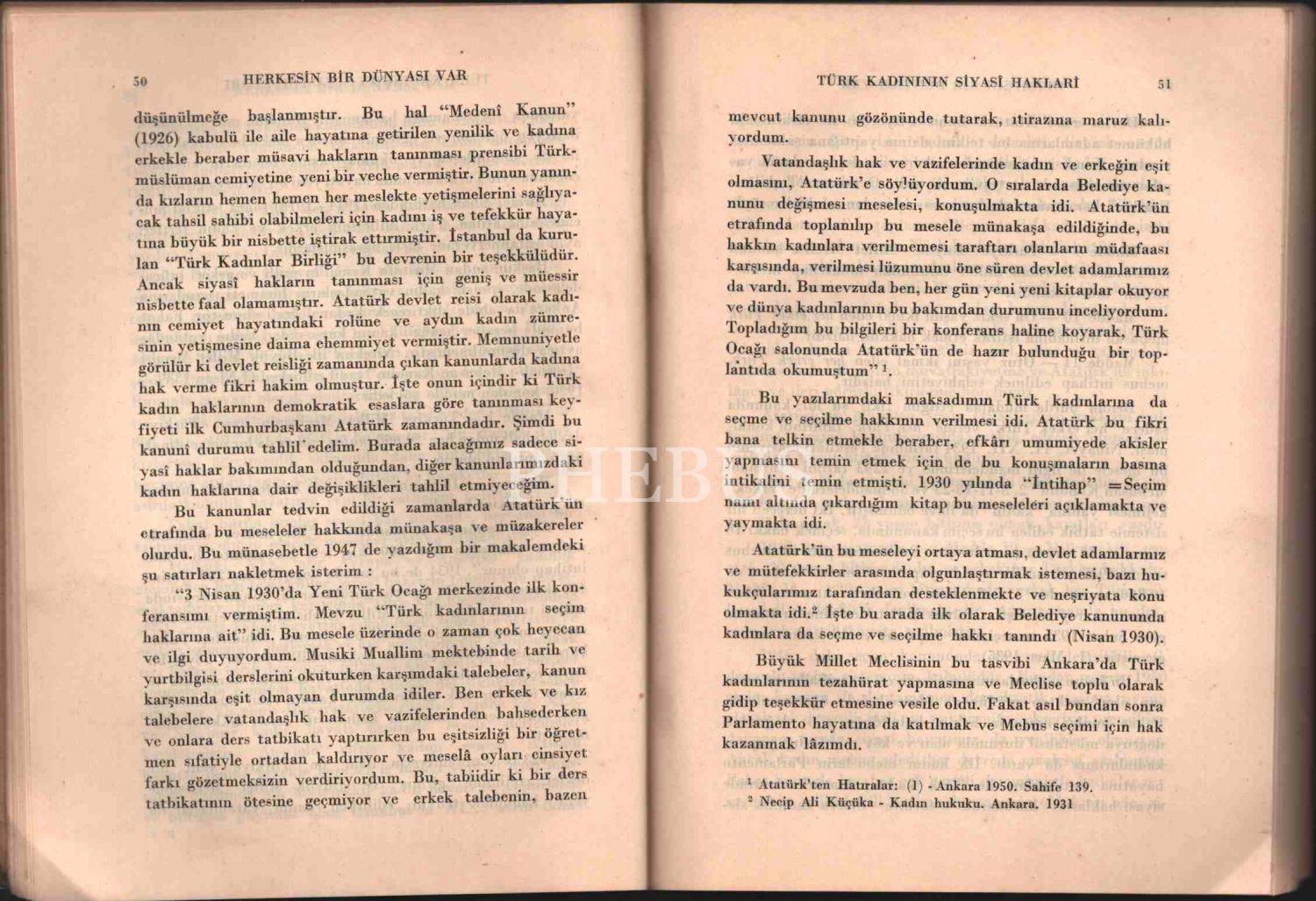 Mustafa Kemal Atatürk´ün manevi kızı olan Afet İnan, Cumhuriyetin ilk tarih profesörlerinden biri olarak Ankara Üniversitesi Dil ve Tarih-Coğrafya Fakültesi´nde ilk Türk devrim tarihi kürsüsünü kurmuş, sosyoloji ve tarih alanında yaptığı çalışmaları kitap olarak yayınlanmıştır. Oğlu Demir´in bir seyahat esnasında söylediği "Herkesin bir dünyası var" cümlesini kitaba döken Afet İnan bu kitabını üç bölüme ayırır. Birinci bölüm kadın hakları üzerine, ikinci bölüm kendi hatıraları ve yurdun çeşitli yerlerindeki yurt gezilerine, üçüncü bölüm ise Gevher Nesibe Hatun Kayesi Şifaiyesine aittir.