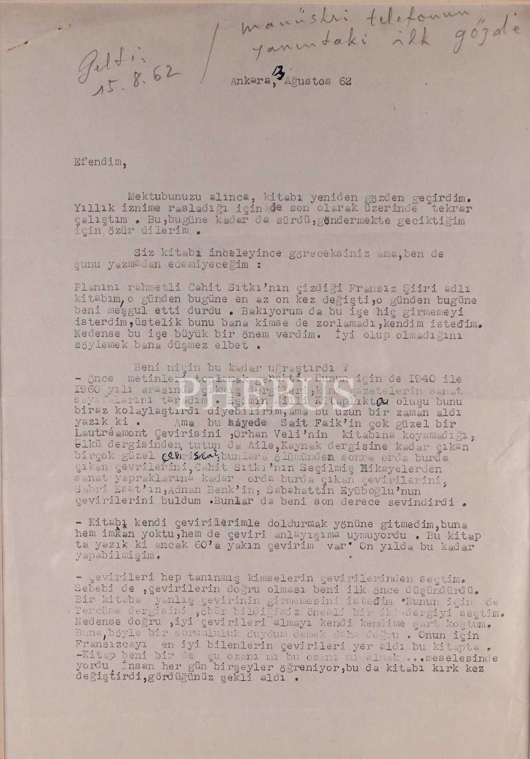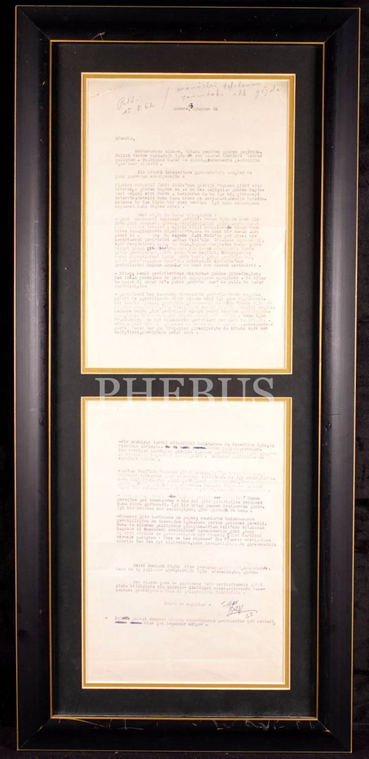 İlhan Berk tarafından yazılmış 1962 tarihli mektup (2 sayfa), çerçeve: 35x76 cm