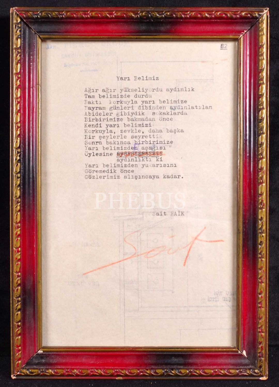 Sait Faik´in, Dr. Fikret Ürgüp antetli kâğıda daktiloyla yazıp imzaladığı YARI BELİMİZ şiiri, çerçeve: 18x26,5 cm