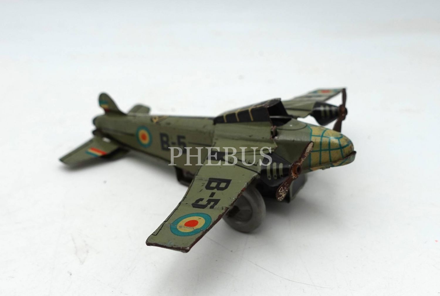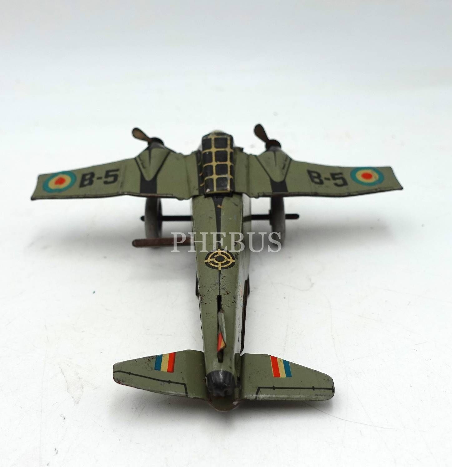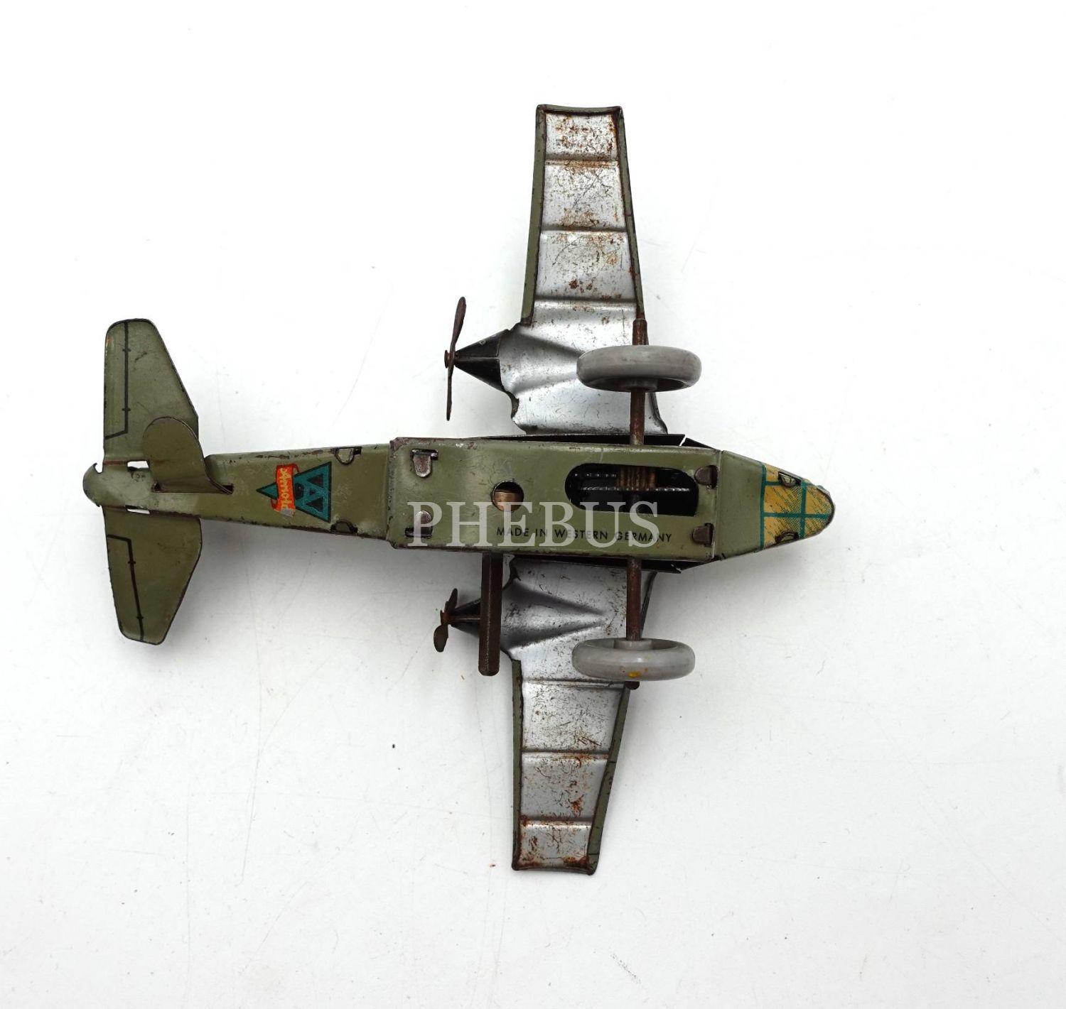 Batı Almanya malı ARNOLD marka kurmalı teneke oyuncak savaş uçağı, denenmedi, 11x11x3 cm