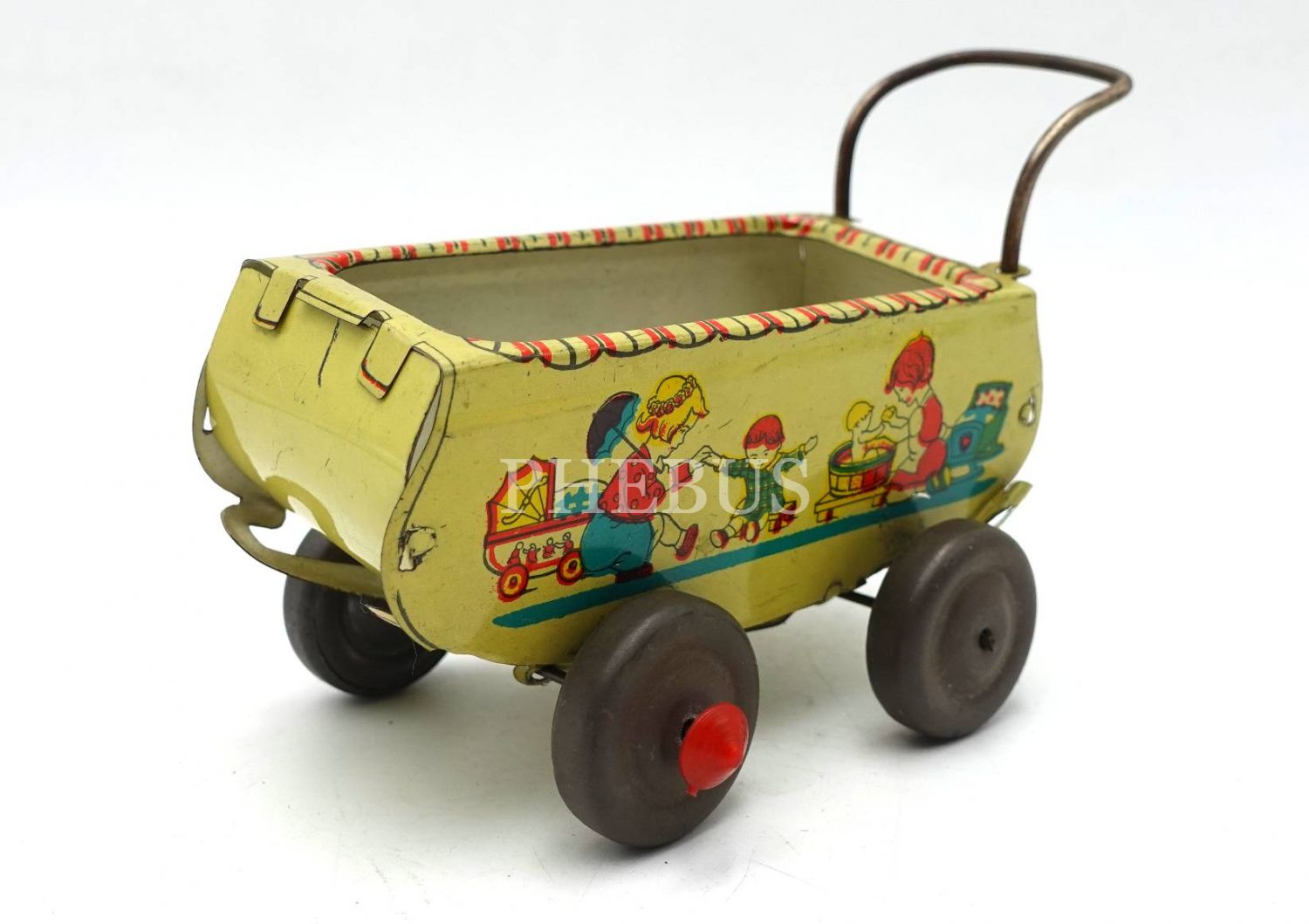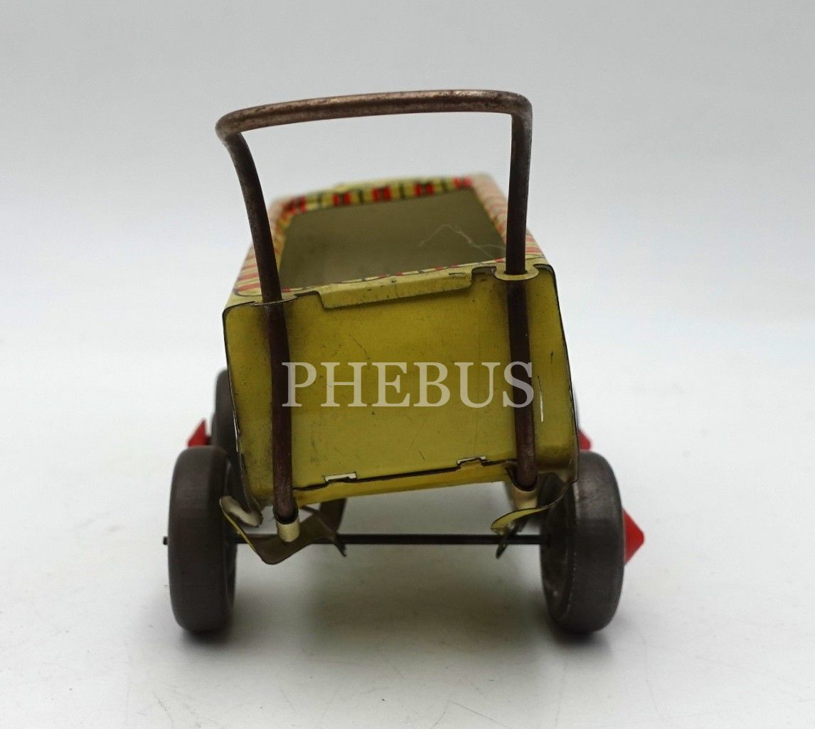 Teneke oyuncak bebek arabası, sol arka tekerde kırmızı bir parça eksik haliyle, 12x8x4 cm