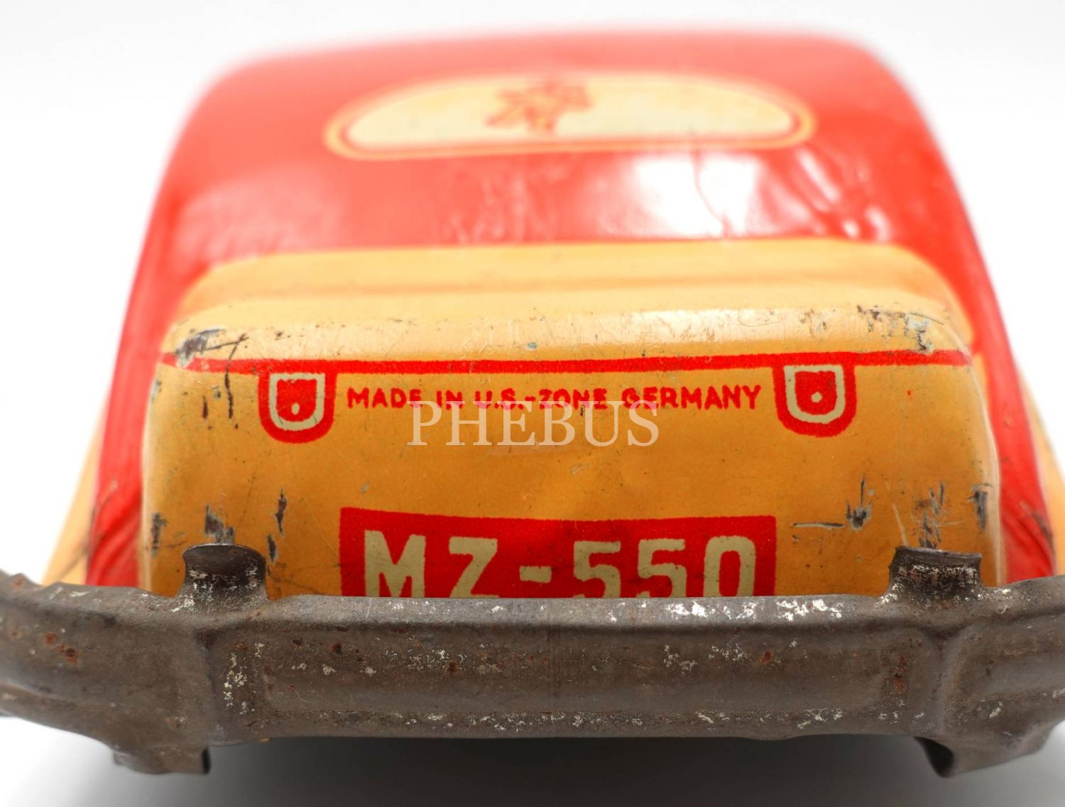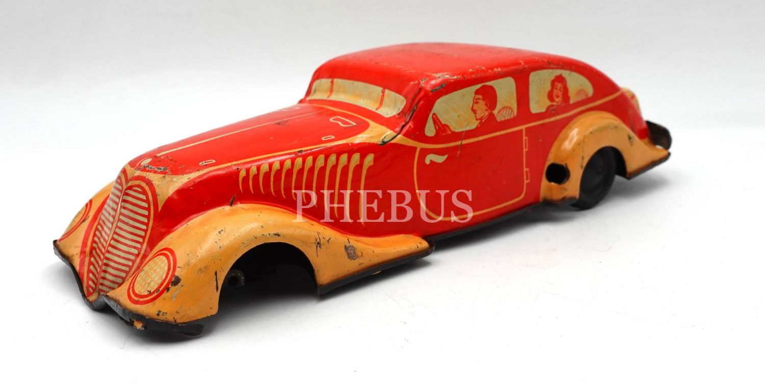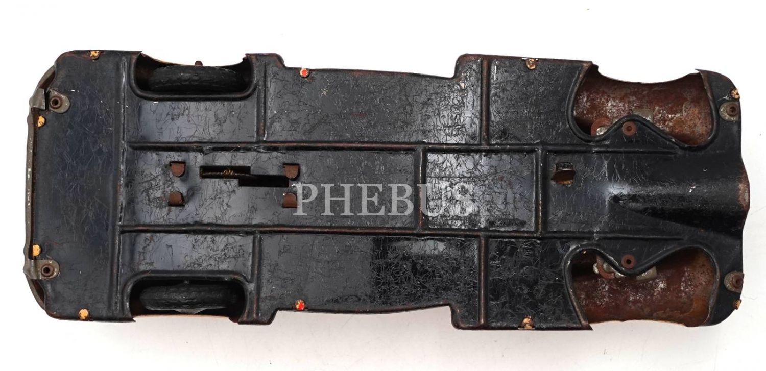 Amerikan Koalisyonu yönetiminde Almanya´da üretilmiş kurmalı teneke oyuncak araba, ön iki tekeri eksik haliyle, denenmedi, 21x7x5 cm