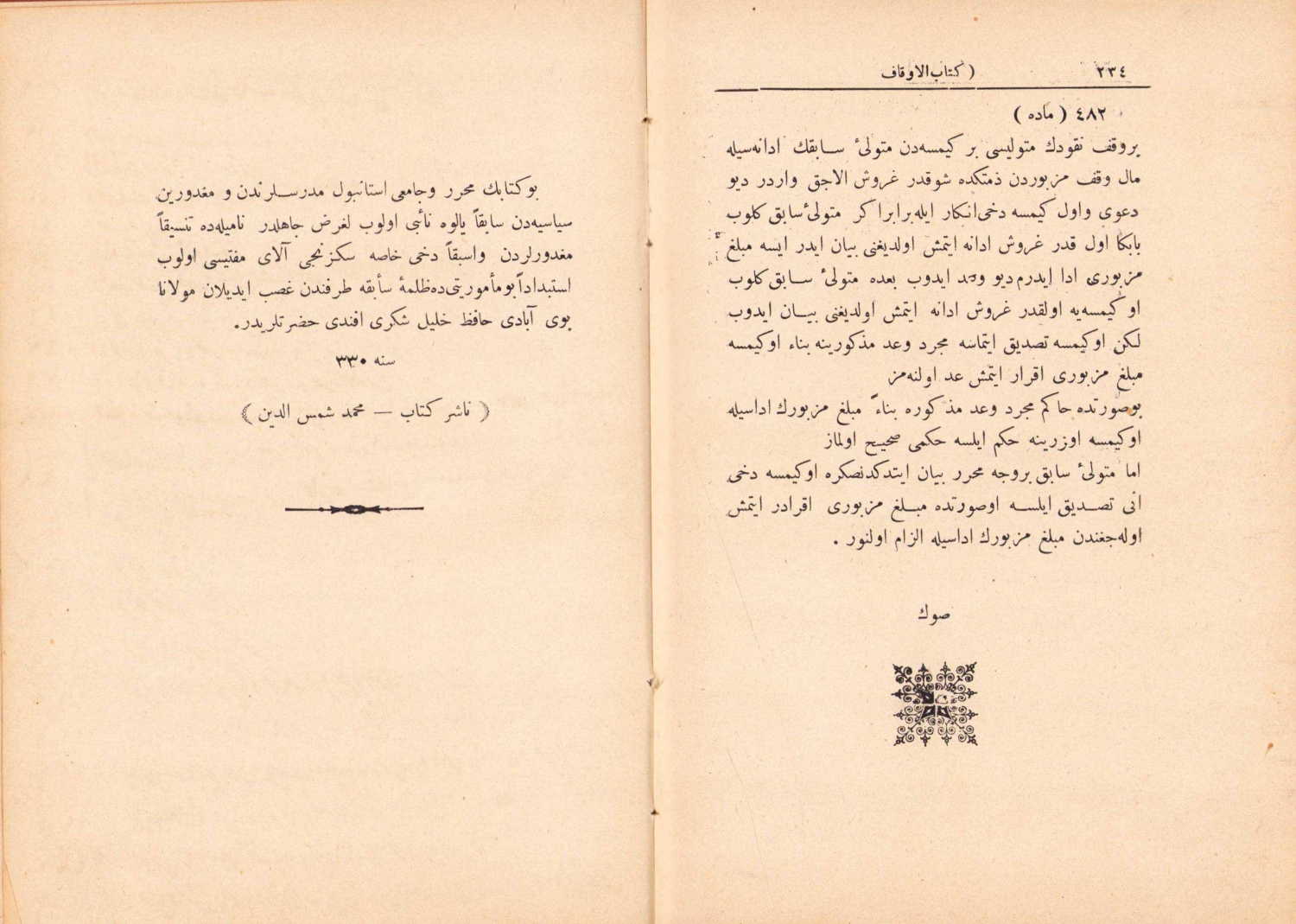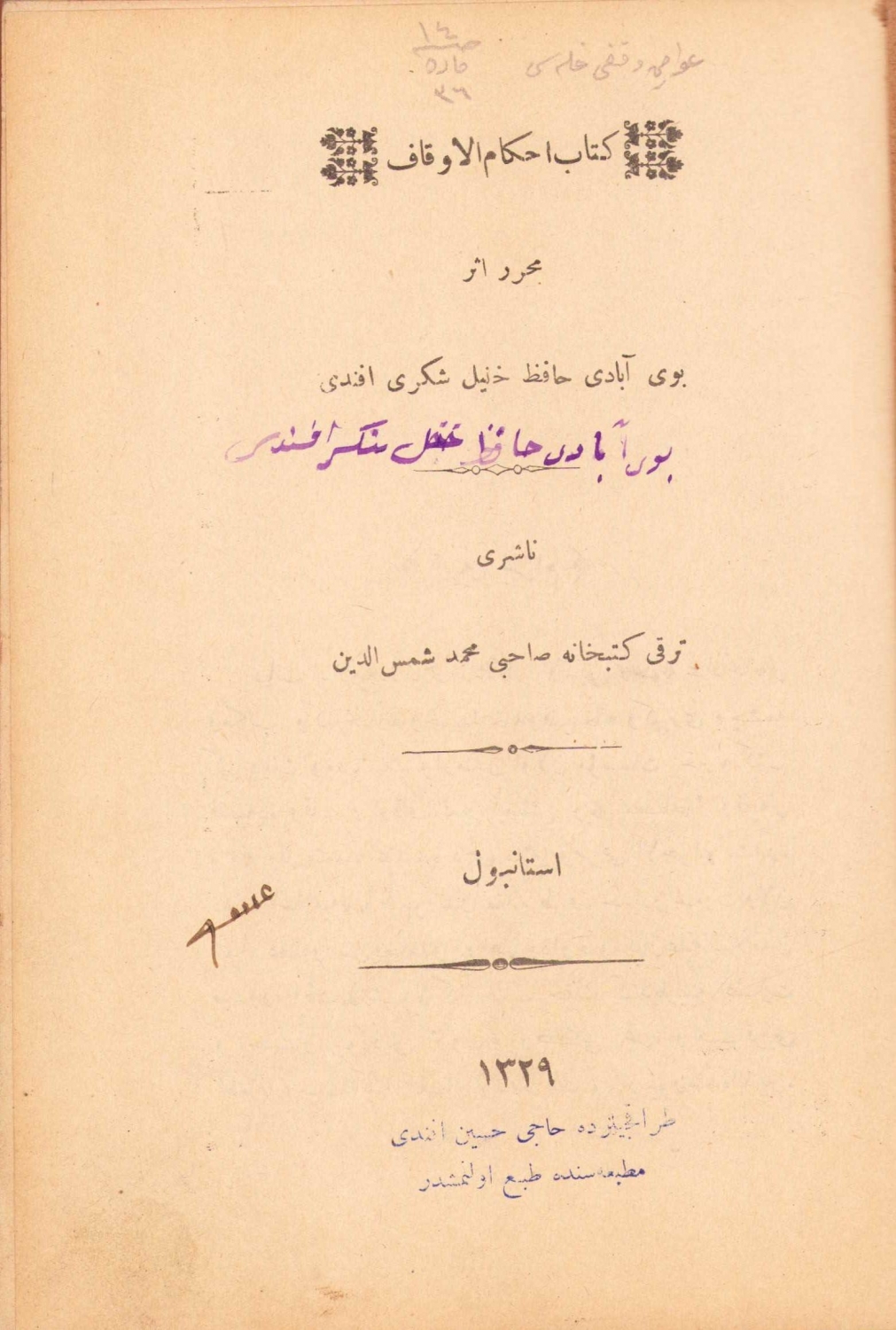 Kitabül Ahkamı Evkaf, Naşırı Mehmed Şemsettin, Terakki Kitaphanesi, Hacı Hüseyin Efendi Matbaası, İstanbul, 1329, Osmanlıca, 234 sayfa, 13x20 cm