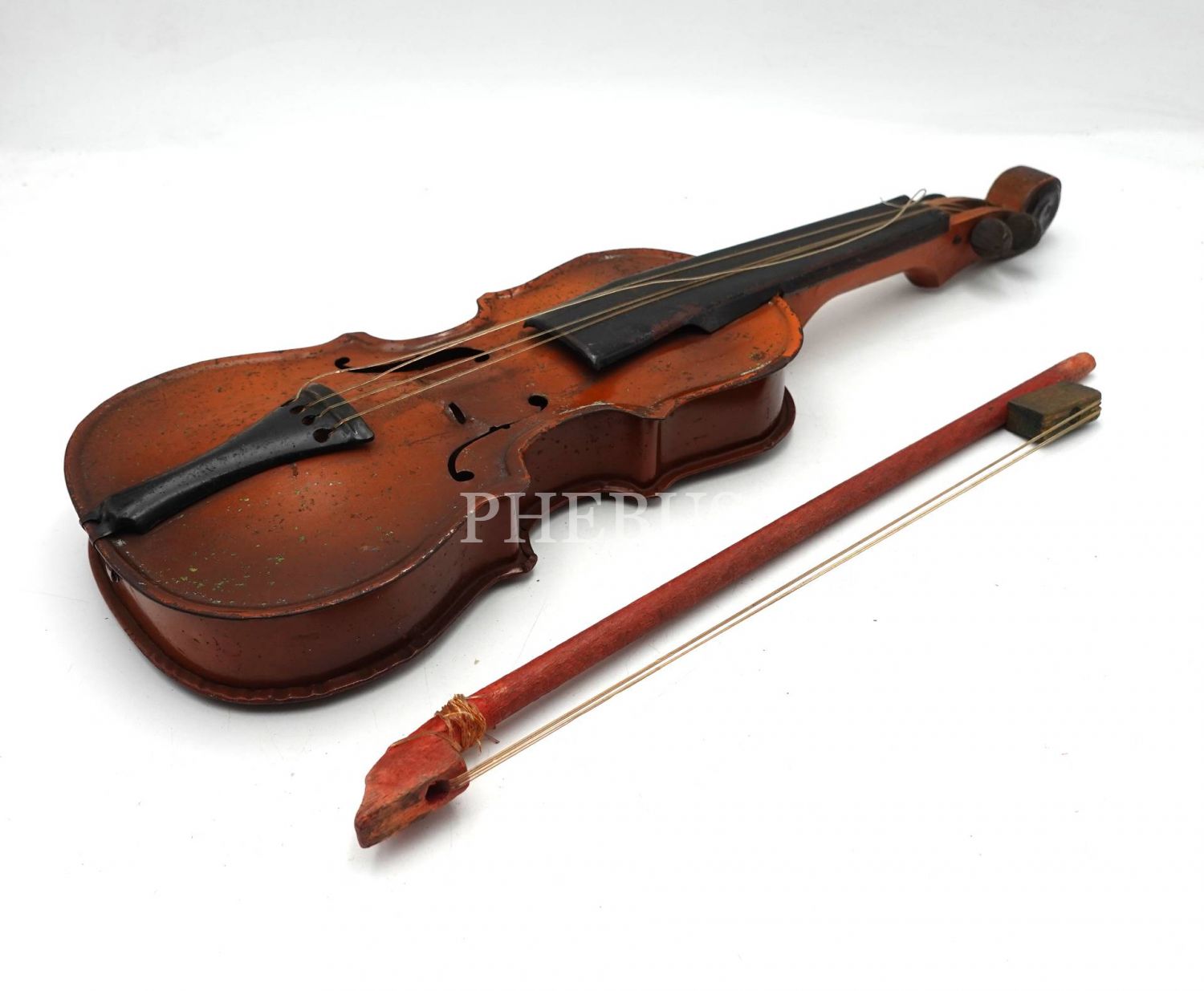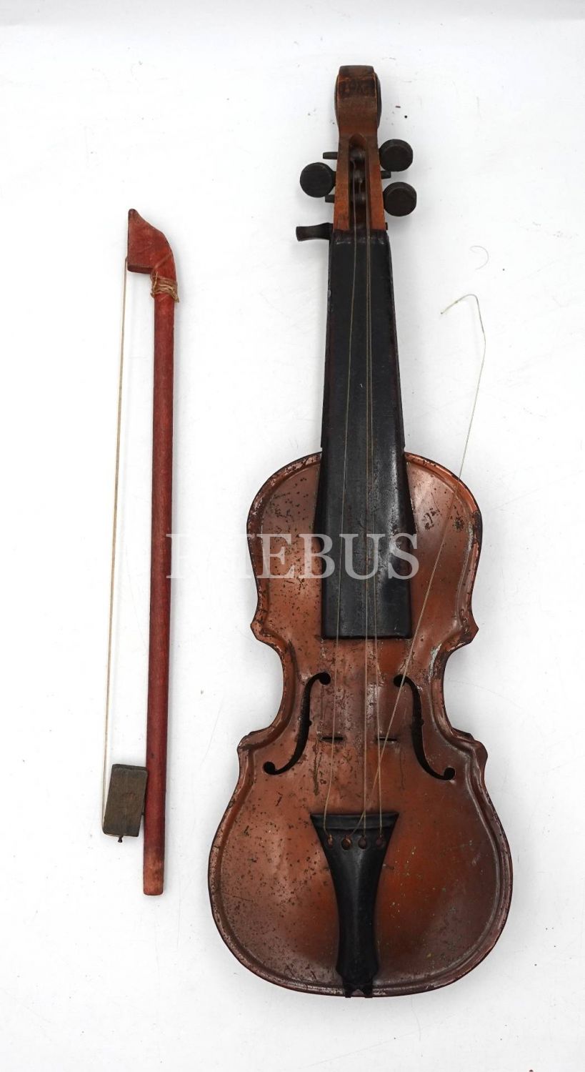 Teneke oyuncak keman, bir teli kopuk haliyle, 38x12 cm