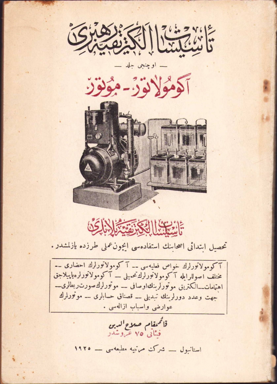 Tesisat-ı Elektriye Rehberi Akümülatör ve Motor 3. Cilt, Selahaddin, Şirket-i Mürettibiye Matbaası, İstanbul, 1925, Osmanlıca, 30 plan - 51 şekil mevcut, 13x19 cm