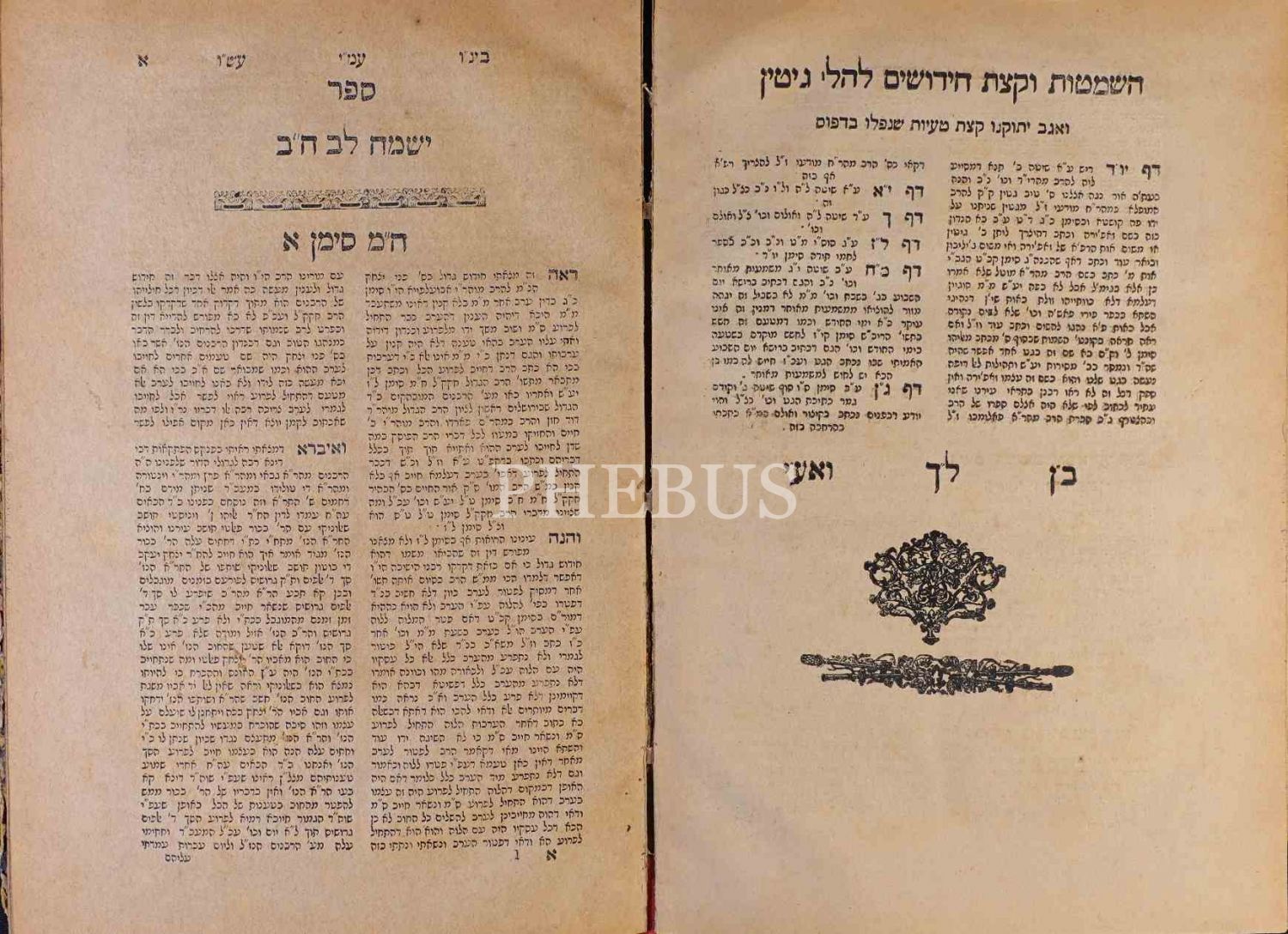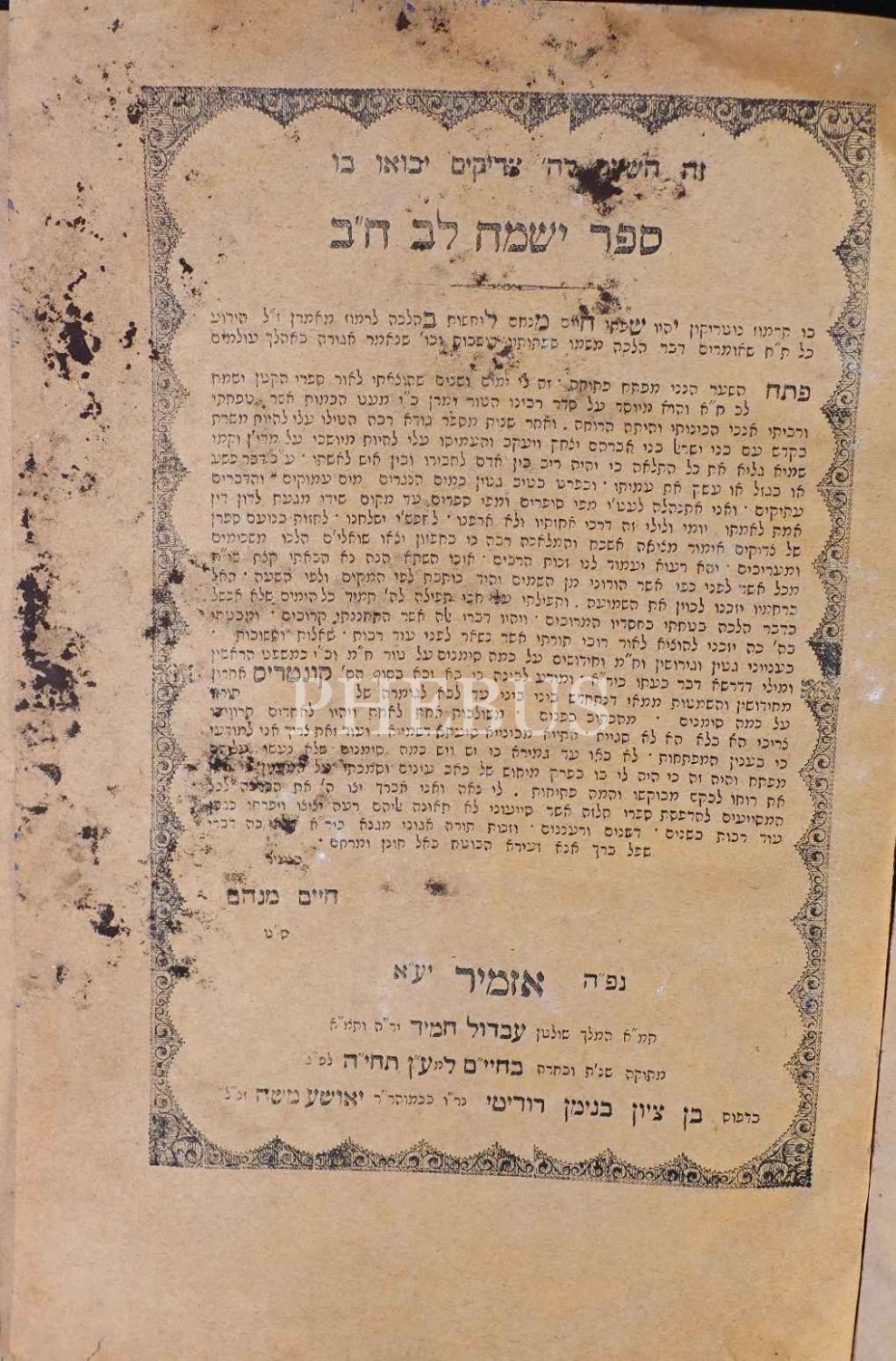 Sefer Yismah Lev, (ספר ישמח לב) , Shulchan Aruch, Halachot (Hahamların/Bilginlerin Dini Vecibe ve Hükümleri), İzmir 5603 (1843) baskısı, künye sayfası Sultan Selim ithaflı, Ben Sion Binyamin Roditi ve Şti., 146+242 s.