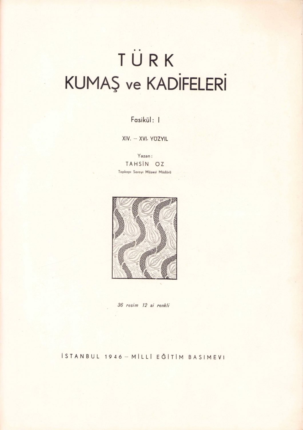 Türk Kumaş ve Kadifeleri -Fasikül: I, Tahsiz Öz, Milli Eğitim Basımevi, İstanbul, 1946, 36 resim 12 si renkli, 125 sayfa, 24x33 cm