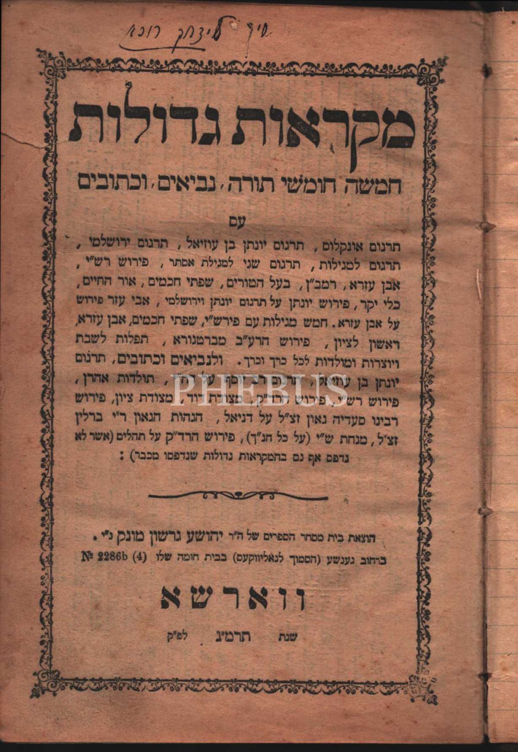 Mikraot Gedolot ( מקראות גדולות ), Tehilim (Mezmurlar-Zebur), Onkalus ve Rashi yorumlu, Varşova 1883 (5643) baskısı, Yeshua Gershon Monek, Mishle