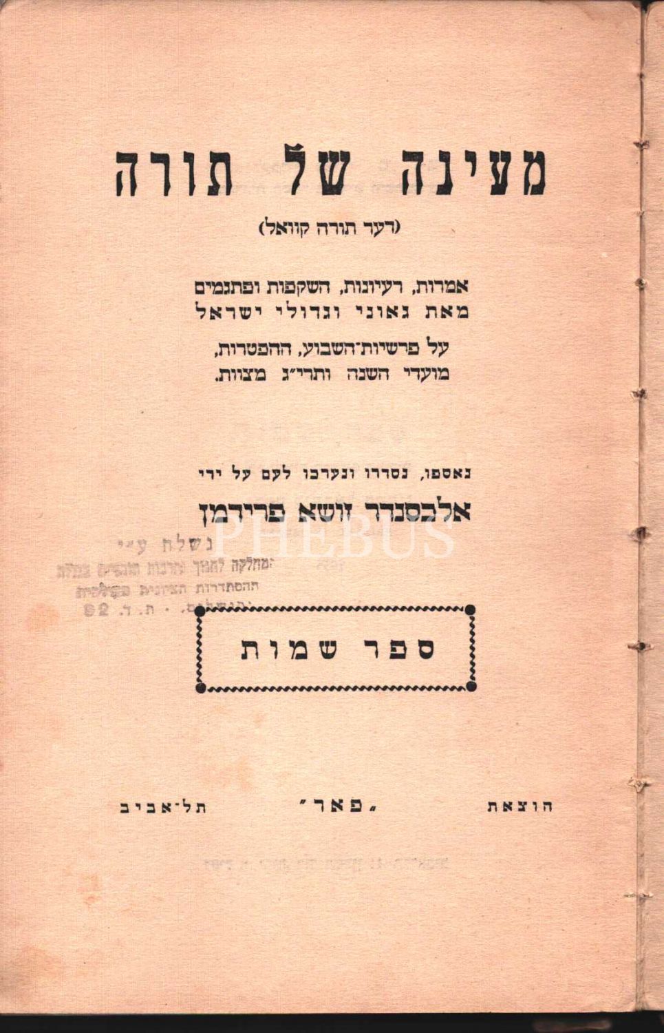 Meinah Shel Torah Sefer Shemot, Tevrat 2. Kitabı, Açıklamalı Metinler İçerir. Düzenleyen Alexandr Friedman, İsrail Tel Aviv A. Yarom baskısı, 1955, 184 s.