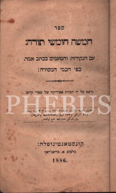 İbranice Kitap, Tevrat ( תּוֹרָה ), 5 kısım bir arada, Constantinople 1886, Boyacıyan Matbaası, 302 s.