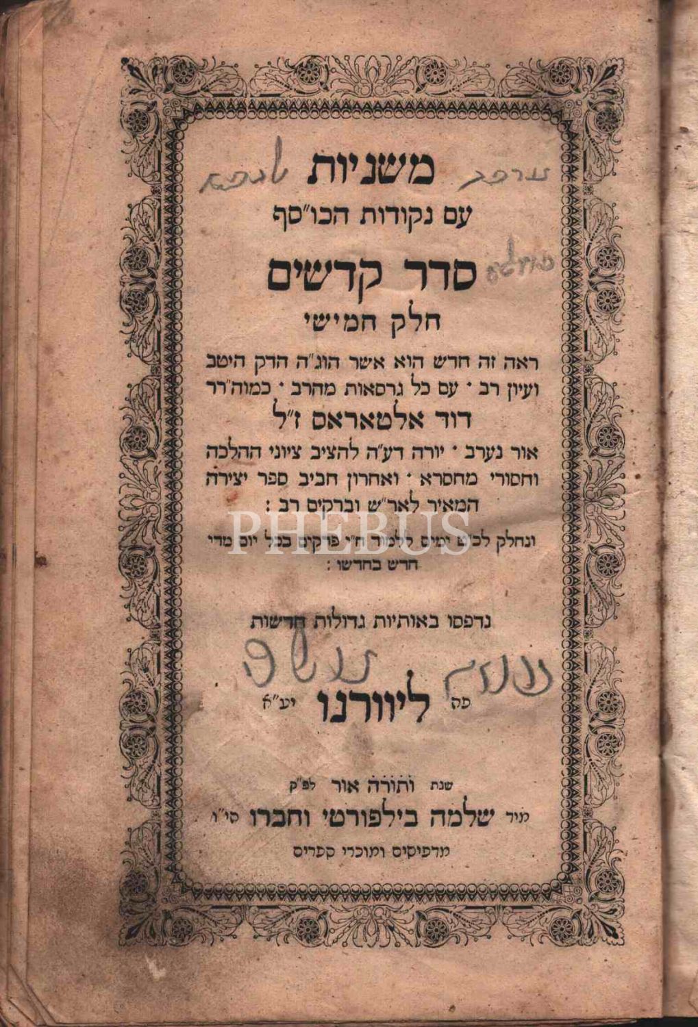 İbranice Kitap, Mishnayot, Seder Kedoshim, (מִשְׁנָה), Yahudi Bilginlerin Dini Görüşlerini İçerir. 5. Cilt, İtalya Lİvorno baskısı, 172 s.