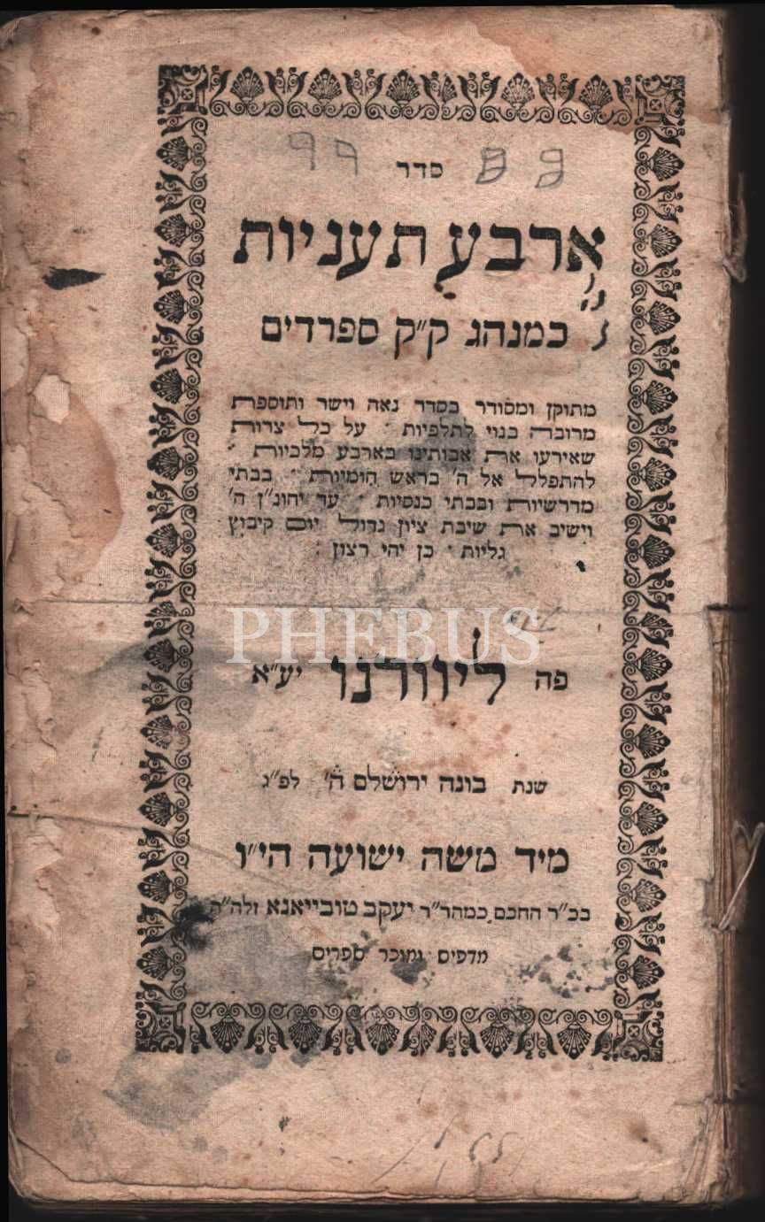 Arba Ta´aniyot,ארבע תעניות , 4 ayrı Oruç ile İlgili Dua Kitabı, (Asara Betevet, Tish´a Be´Av, Tsom Ester, Asara Be Tamuz), İtalya Livorno Moshe Yeshua Matbaası