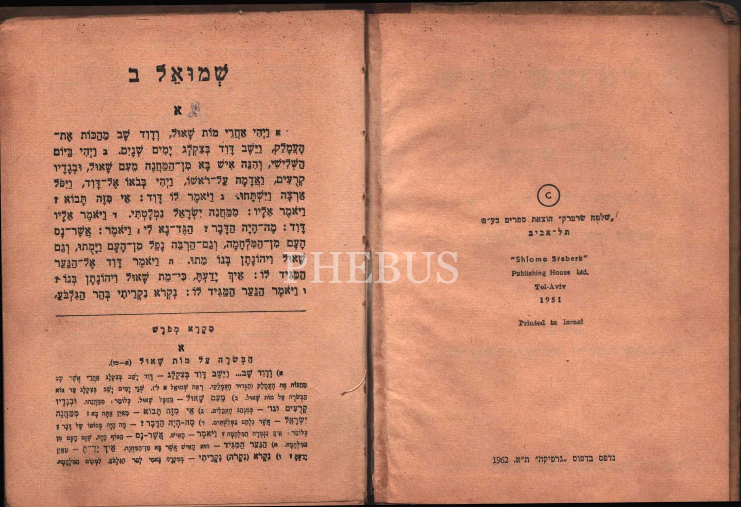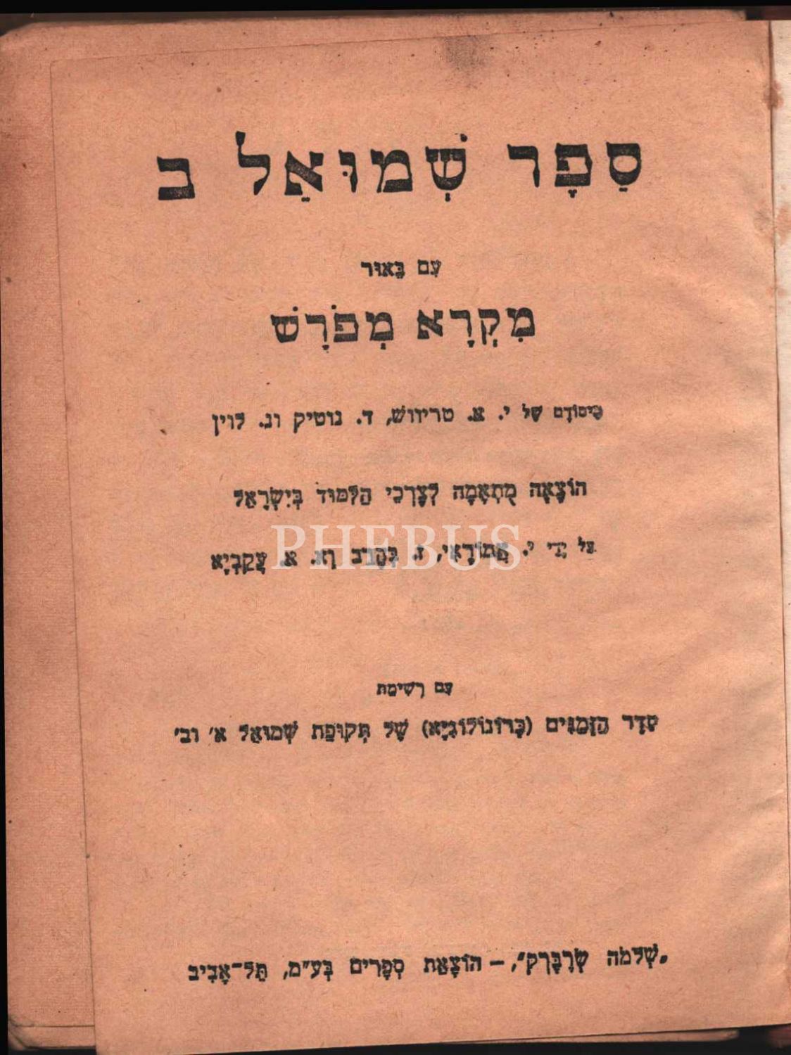 Sefer Shemuel B, Yahudi Nebiler Kitabından 2. Kısım, Shemuel. Tel Aviv Baskısı 1962, Yayıncısı Shelomo Sreberg TA (1951), Graphica Matbaası, 91 s.