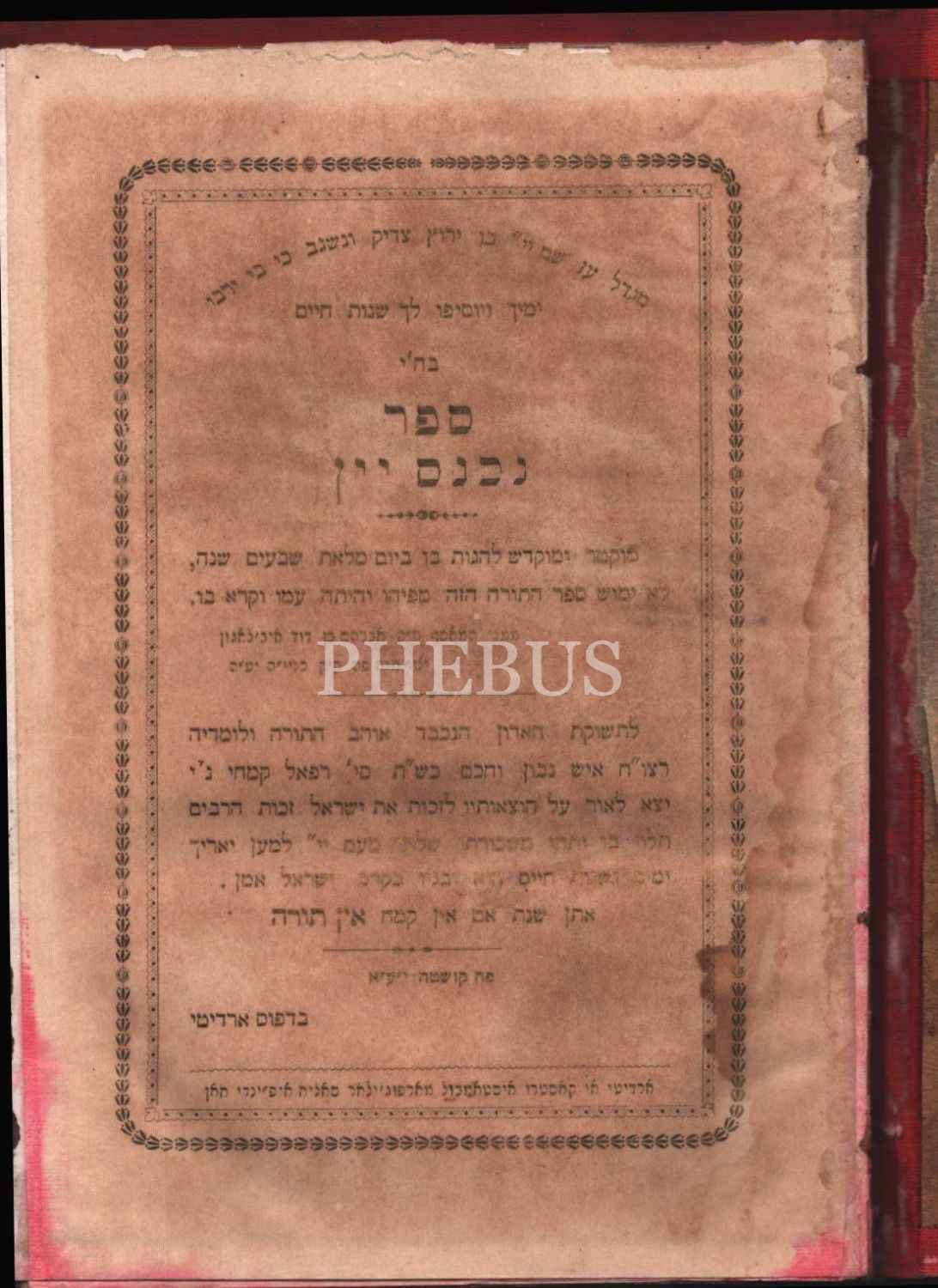 Sefer Nihnas Yayin (נכנס יין), Avram Ben Dod ( איבלאגון, אברהם בן דוד ), İstanbul Marputçular Salih Efendi Han, Mikra, Mishne, Talmud, Midrashim ve Zohar´dan Kısımlar İçerir, 1912 (5672) Ardidi Matbaası, 54 s.