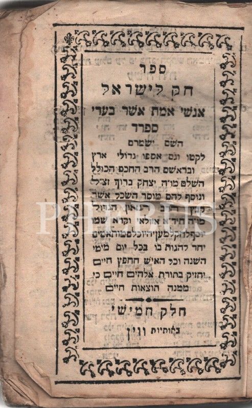 Sefer Hok Leisrael ( ספר חוק לישראל ), Tevrat 5. Kısım Devarim Kitabını içerir. ( דְּבָרִים ) Viyana baskı, 564 s.