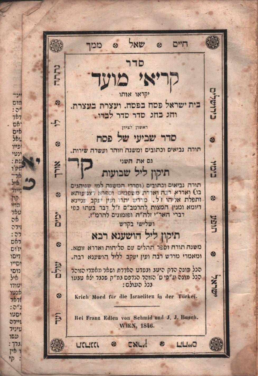 Kriey Hamoed, (קּרּיּﬡיּ מּוּﬠדּ) Pesah-Shavuot-Hoshana Raba Bayram Duaları ile Sonda Tehilim (Zebur) İçerir .. Viyana 1846 baskısı, Franz Edlen Matbaası