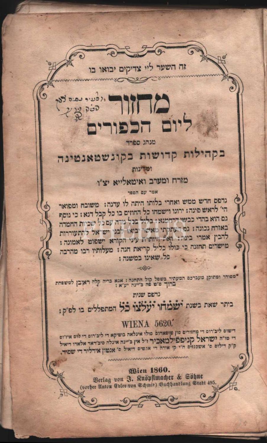 İbranice Kitap, Machzor Le Yom Kipurim (מחזור יוֹם כִּיפּוּר), Viyana Knöpstmacher baskısı, 5620 (1860)