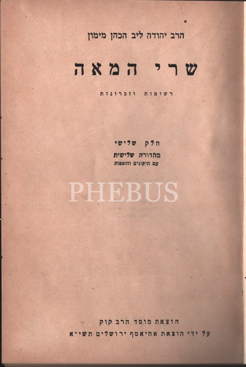 Shirei Hamea, Listeler ve Hatıraları 3. Bölüm, Kudüz Ronald Basımevi. 5711-1951. Dini Yönden 18 Adet Birbiri ile İlintisiz Hatıra ve Yazı İhtiva Eder, 251 s.
