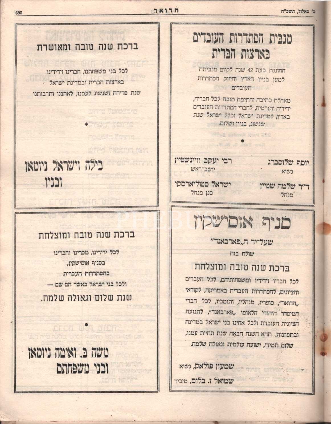 İbranice Hadoar ( הדואר ) Haftalık Gazete: İbrani Sendikasının Amerika´daki Sesi Gazetesi, (Yayıncı: Sendika) New York, 44. Yıl Kislev 5725/ 6 Kasım 1964 ile 17 Elul 5725/ 17 Eylül 1965 tarihleri arasıdır (Toplam 36 Sayı), 712 s.