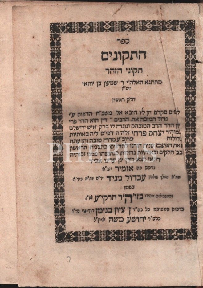 Sefer Hatikunim (ספר התיקונים ) Tikunei Hazohar, Birinci Bölüm, İzmir baskısı, Zion Binyamin Matbaası 5618/1858, künye sayfası Sultan Abdülmecid ithaflı, 464 s.