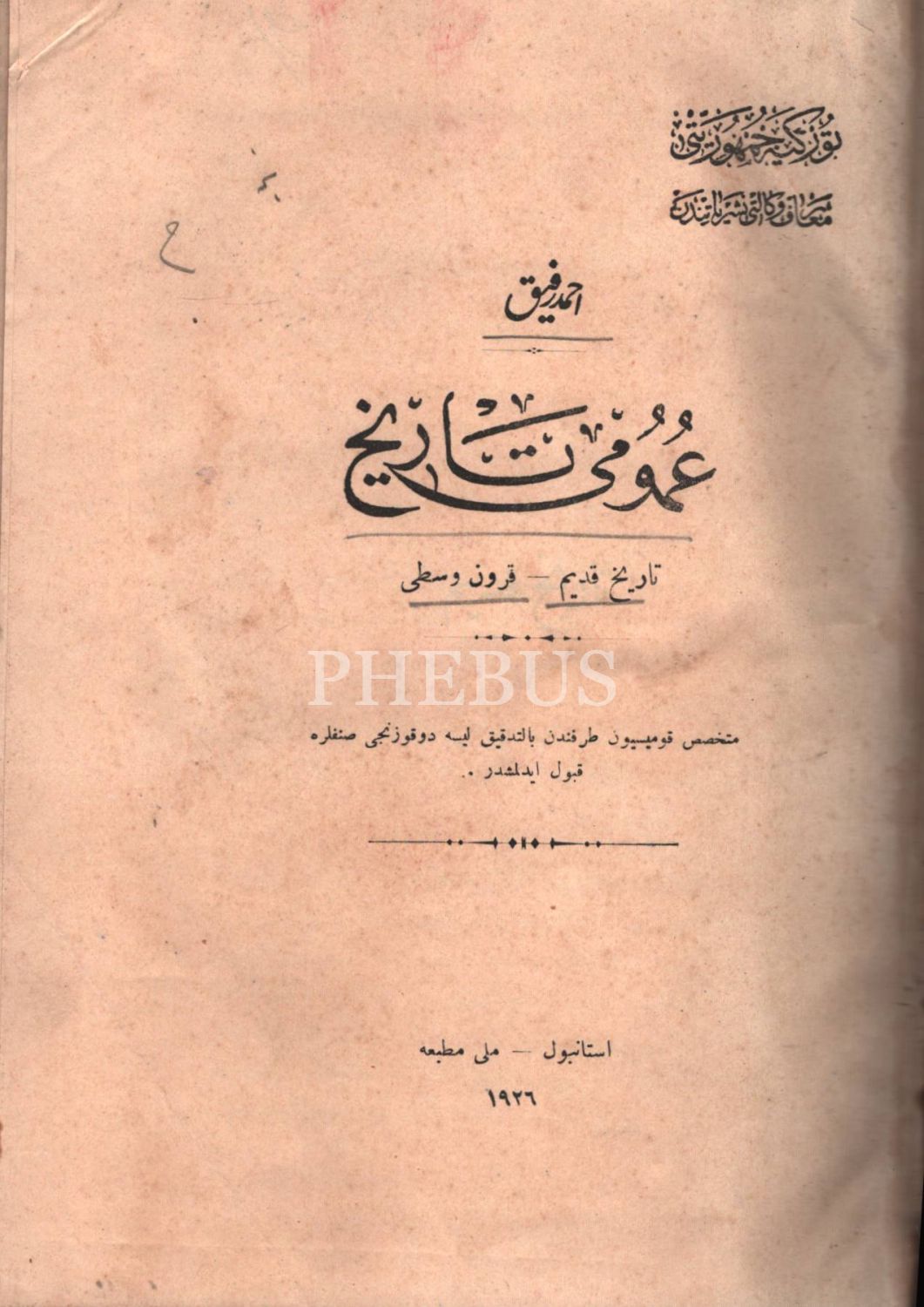 UMÛMÎ TÂRÎH (Târîh-i Kadîm- Kurûn-ı Vustâ [Eski Çağ-Orta Çağ]), Ahmed Refik, Milli Matbaa, İstanbul 1926, 627 s., 17x24 cm