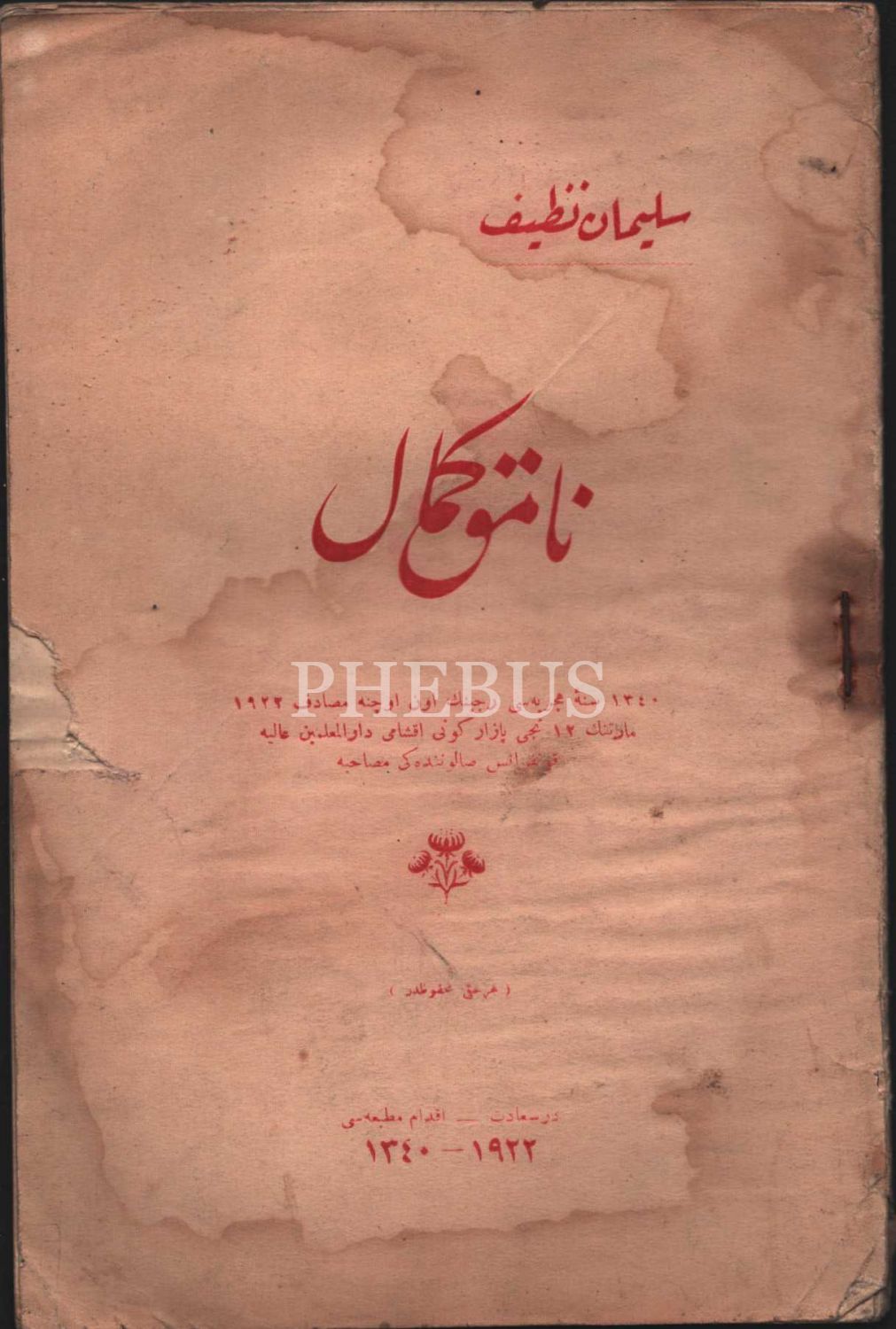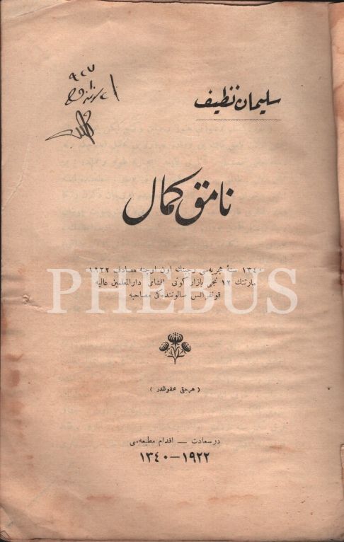 Edebiyat tarihi: NAMIK KEMAL, Süleyman Nazif, İkdam Matbaası, İstanbul 1922, 52 s., 15x23 cm