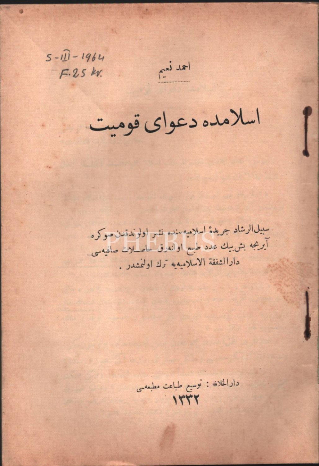 İSLÂM´DA DA´VÂ-YI KAVMİYYET [Irkçılık], [Babanzâde] Ahmed Naim, Tevsi-i Tıbaat Matbaası, İstanbul 1332, 55 s., 14x19 cm