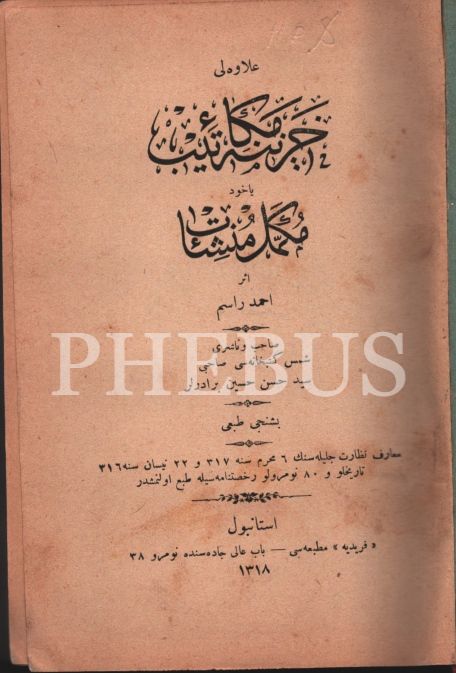 Edebiyat tarihi: İlâveli HAZÎNE-İ MEKÂTİB YÂHÛD MÜKEMMEL MÜNŞEÂT, Ahmed Rasim, Feridiye Matbaası, İstanbul 1318, 415 s., 14x20 cm
