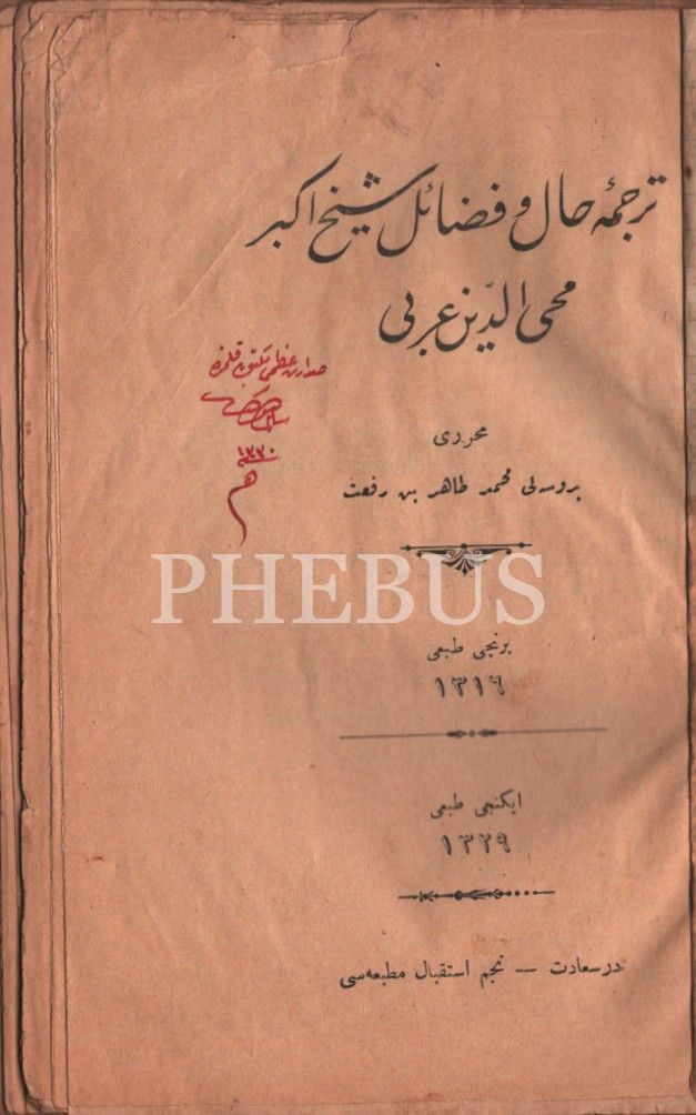 Tasavvuf tarihine ilişkin 2 eser tek ciltte: TERCÜME-İ HÂL VE FEZÂİL-İ ŞEYH-İ EKBER MUHYİDDİN ARABÎ, Mehmed Tahir b. Rifat, Necm-i İstikbâl Matbaası, İstanbul 1329, 47 s.;
