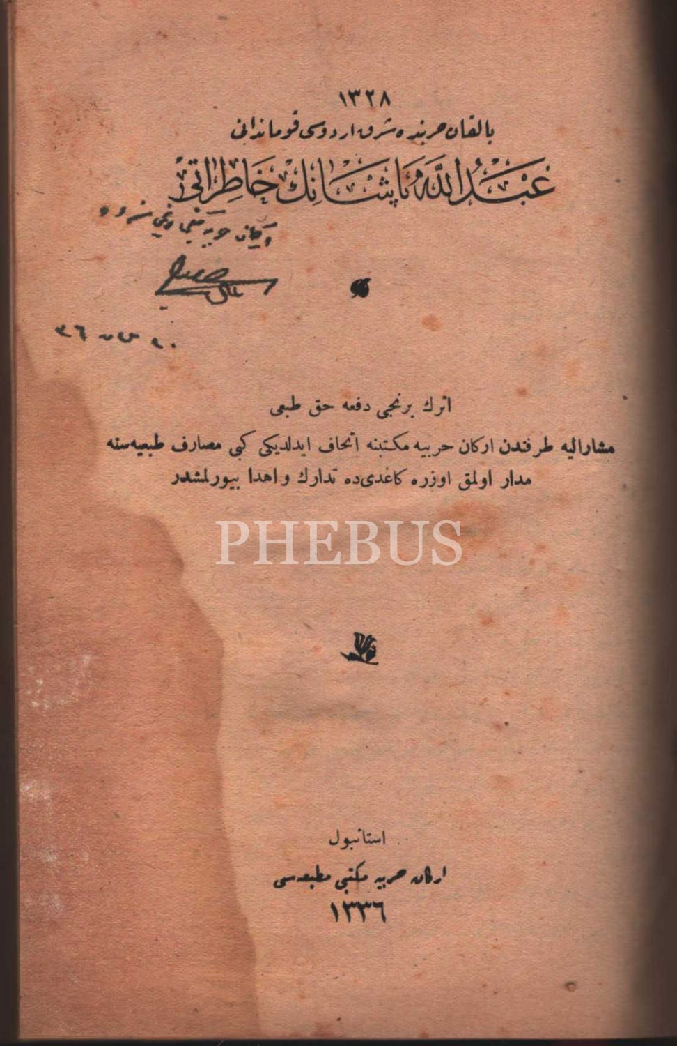 1328 Balkan Harbi´nde Şark Ordusu Kumandanı ABDULLAH PAŞA´NIN HÂTIRÂTI, harita ekleriyle, ithaflı ve imzalı, Erkân-ı Harbiye Mektebi Matbaası, İstanbul 1336, 232 s., 15x22 cm