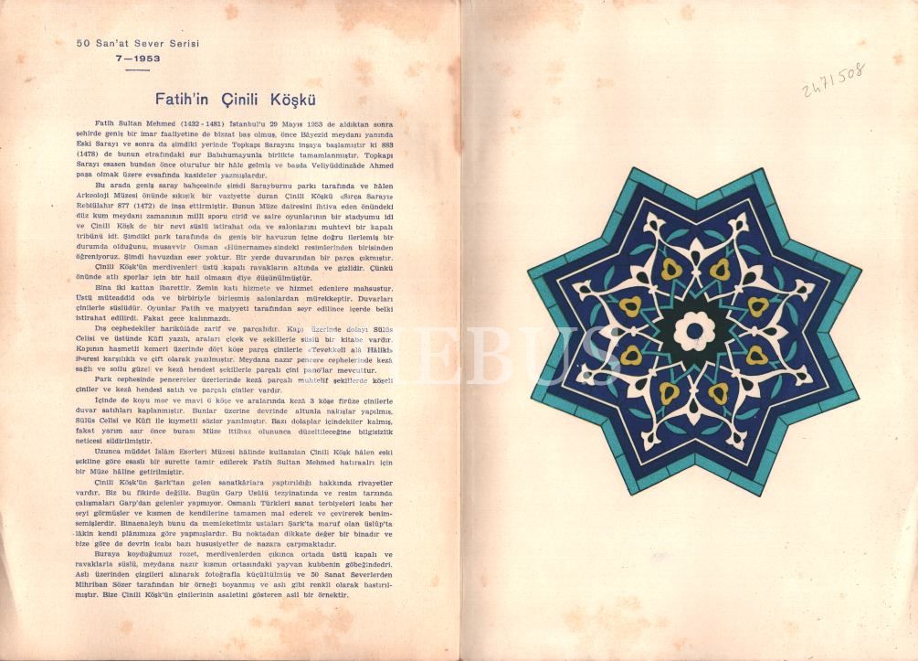İSTANBUL´UN 500. YILINDA ÇİNİLİ KÖŞK TAVAN GÖBEĞİ, 50 Sanatsever Serisi, A. S. Ünver, 2 sayfa