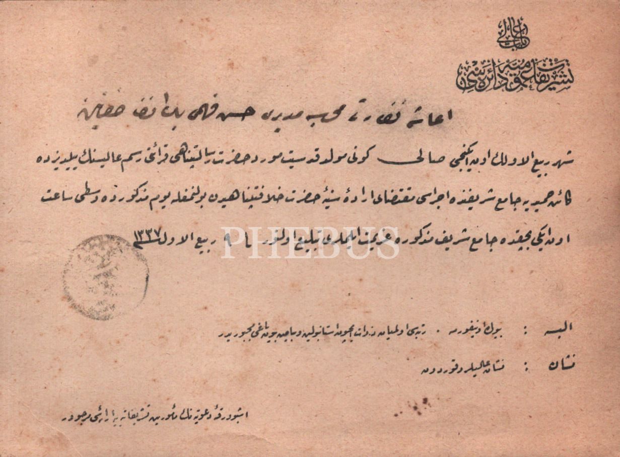 Yıldız Hamidiye Camii'ndeki mevlid merasimi için İaşe Nezareti Muhasebe Müdürü Hasan Fehmi Bey´e, davetiye, 1337 tarihli ve Bâbıâlî Teşrifât-ı Umûmiye Dairesi mühürlü, 12x15 cm