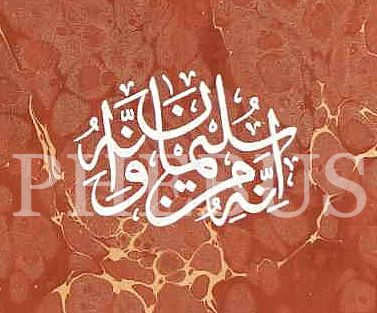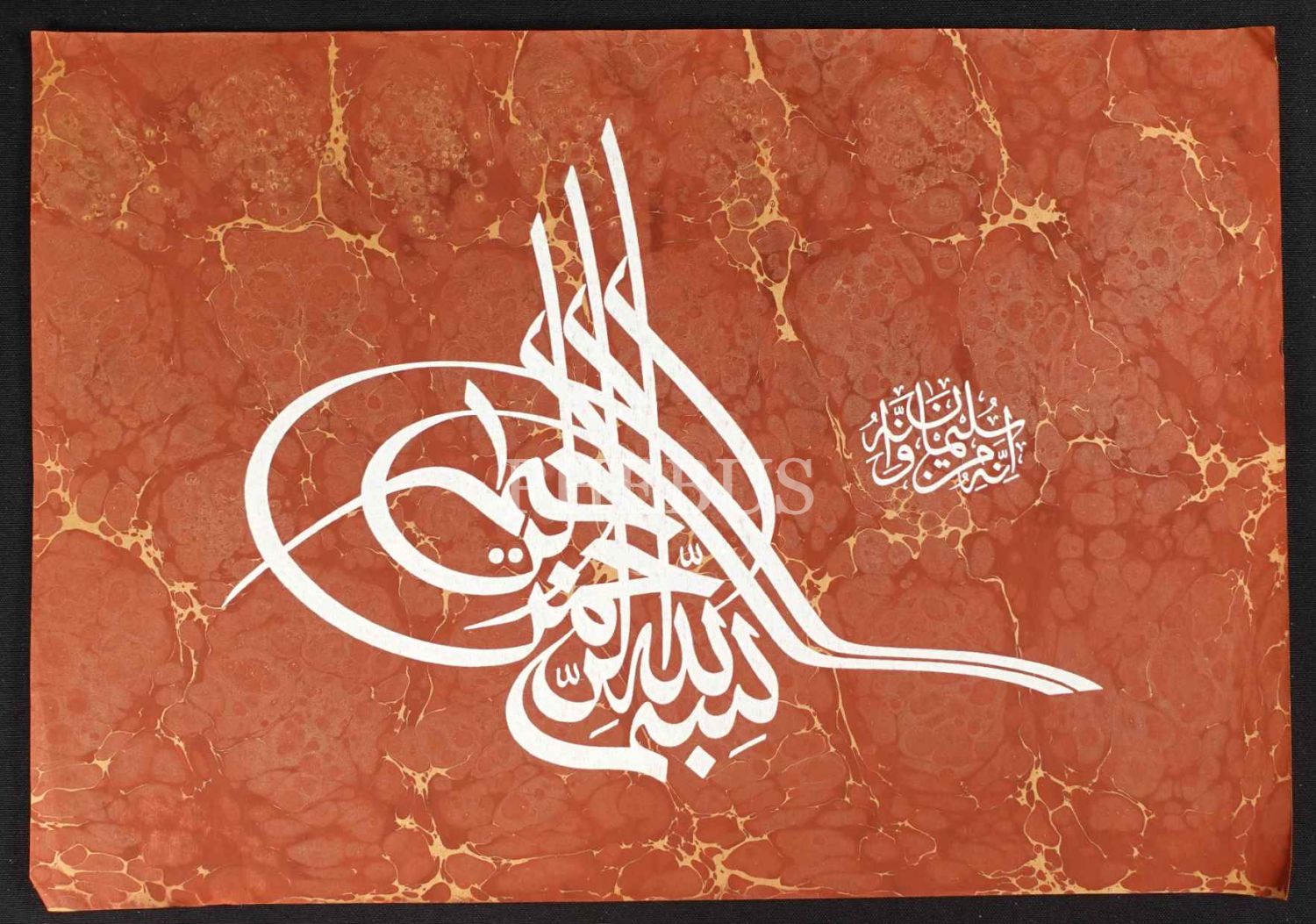 Ebru zemin üzerinde tuğra formlu celî sülüs ayet (Neml/30), 34x49 cm