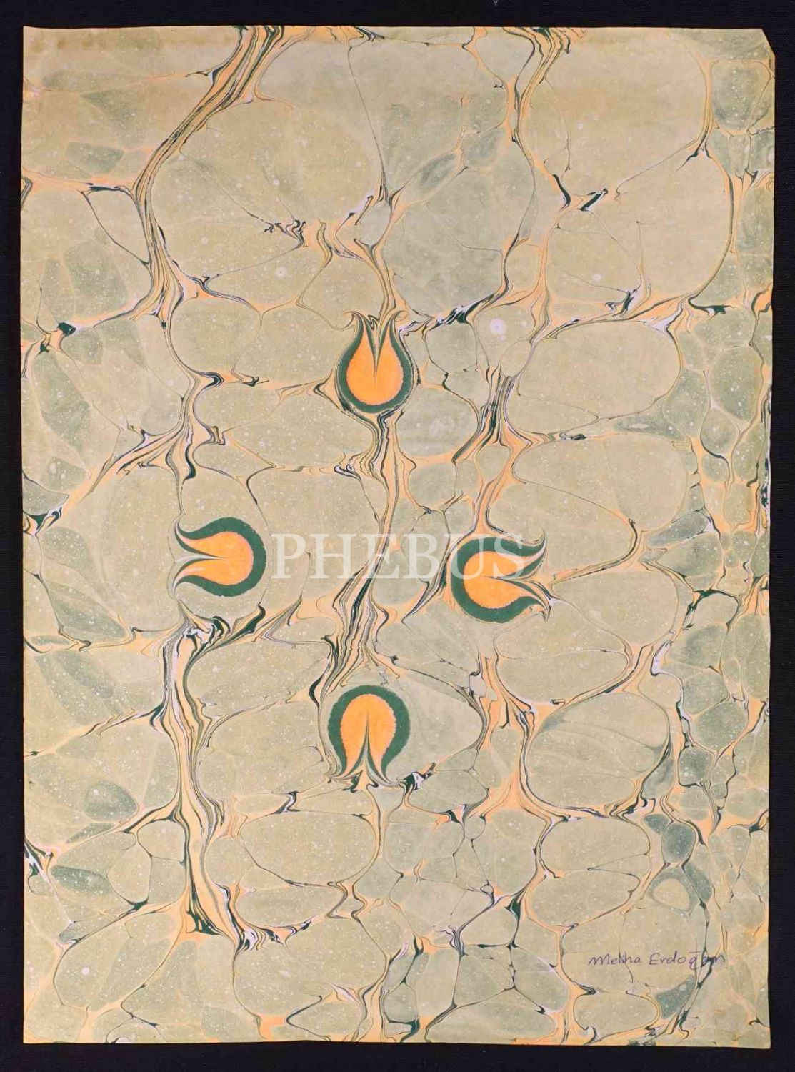 Meliha Erdoğan imzalı çiçekli ebru, 34x47 cm