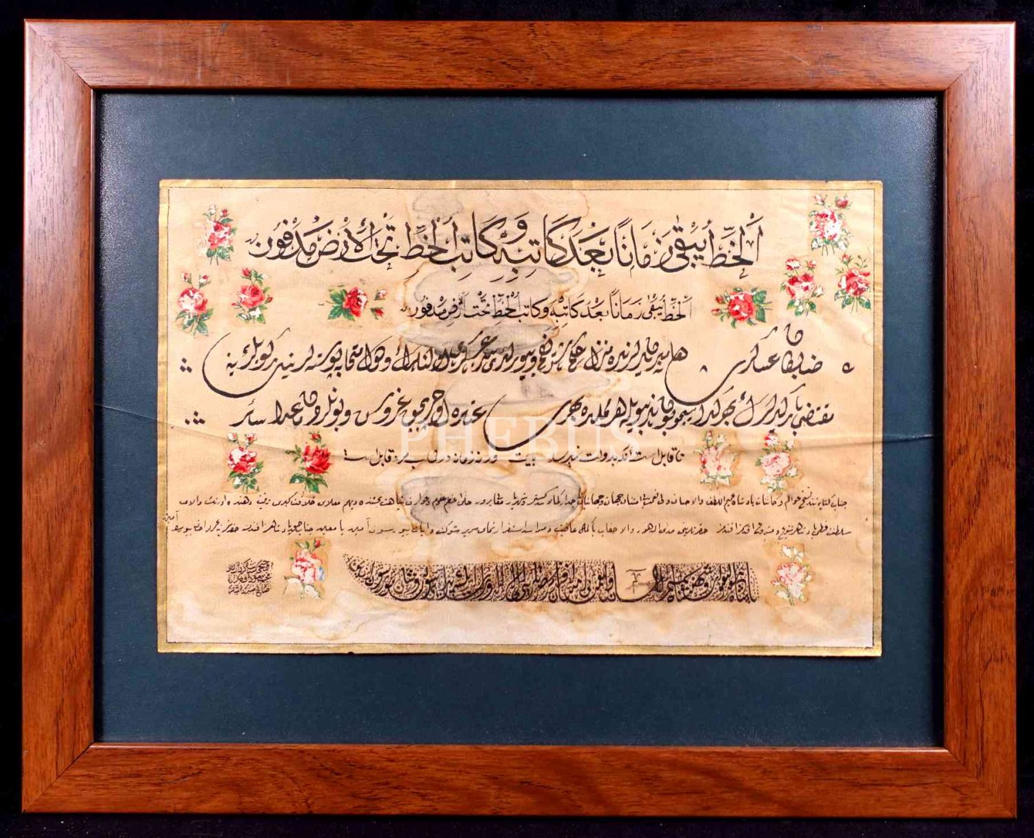 Hutût-ı mütenevvia [bütün yazı çeşitleri] ile, "üçüncü sene şakirdanından Mahmud İkbalzâde(?) Salih" ketebeli eski dönem levha, yazı: 23x36 cm, çerçeve: 38x48 cm