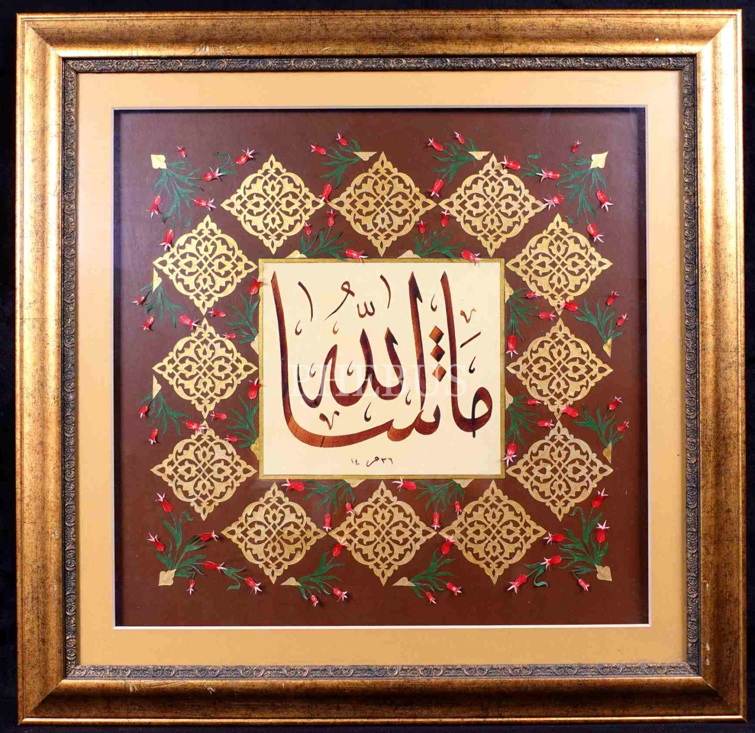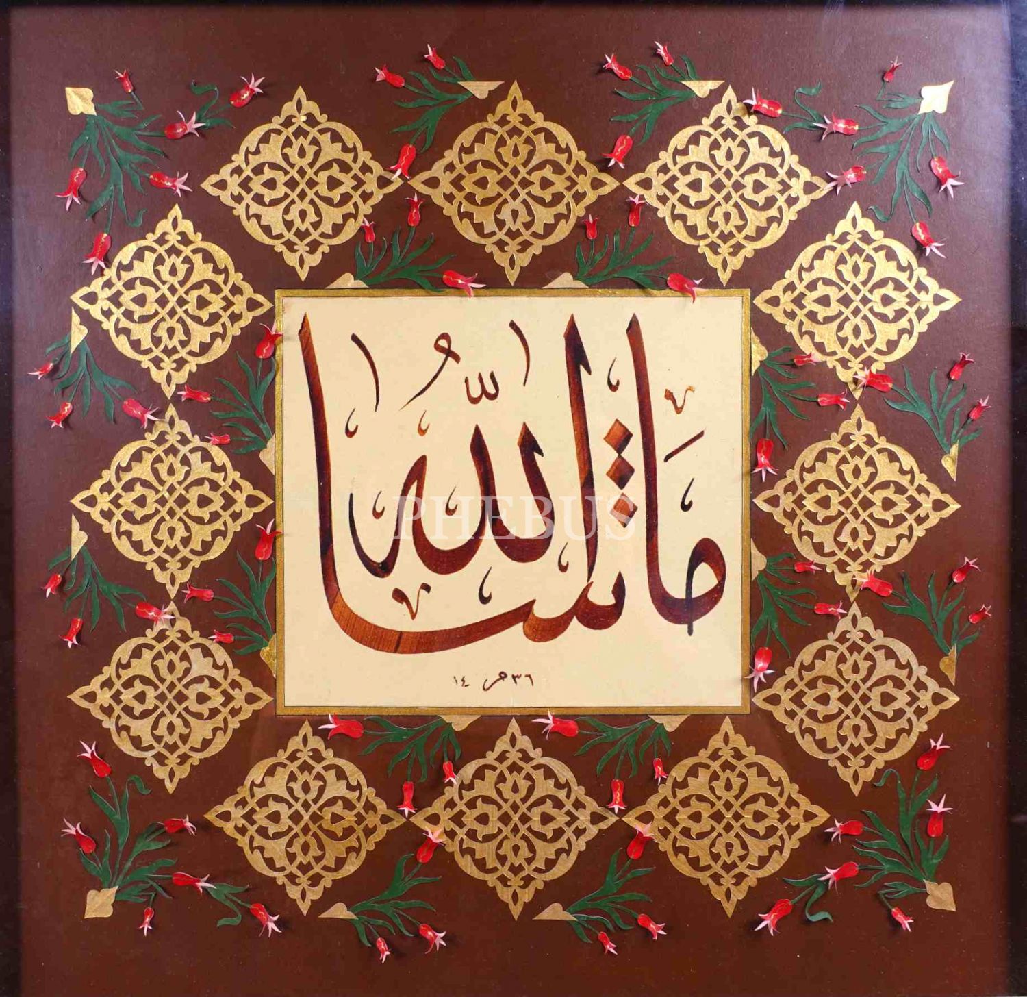 Katı' ile tezyin edilmiş, 1436 tarihli celî sülüs "Maşallah", katı': Dilek Mutlu Düşel, 49x49 cm