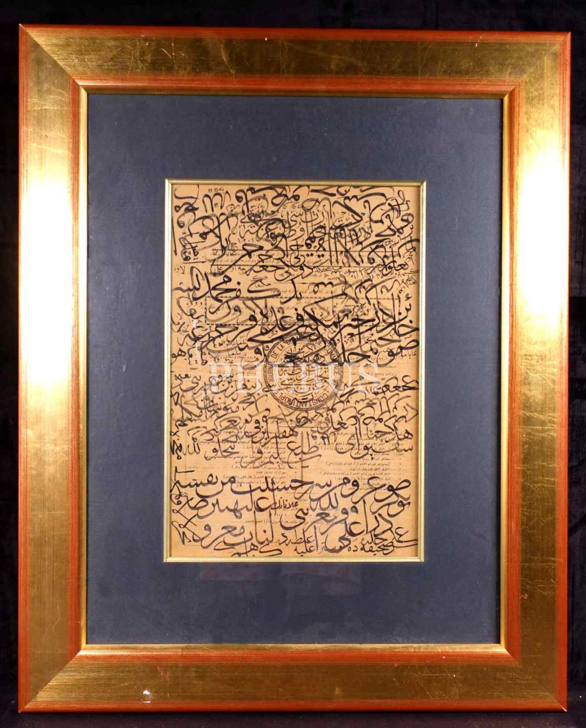 Fransızca ve Osmanlıca İstanbul Ticaret Odası gazetesi üzerinde Nuri [Korman] ketebeli sülüs hattat karalamaları (arkalı önlü), yazı: 26x40 cm, çerçeve: 58x70 cm