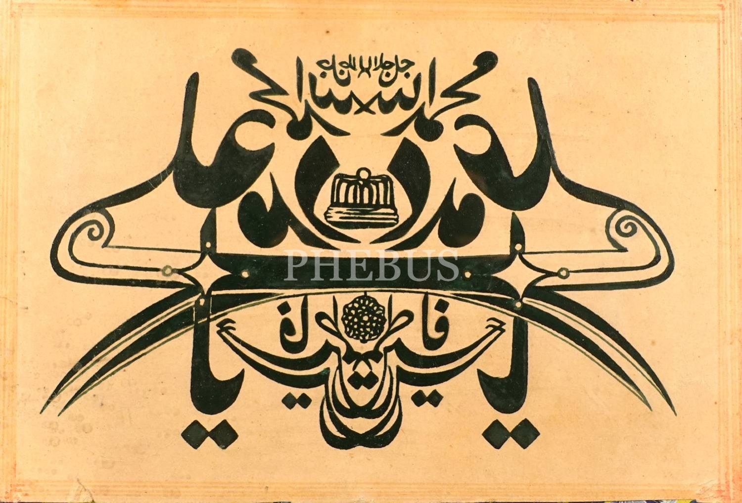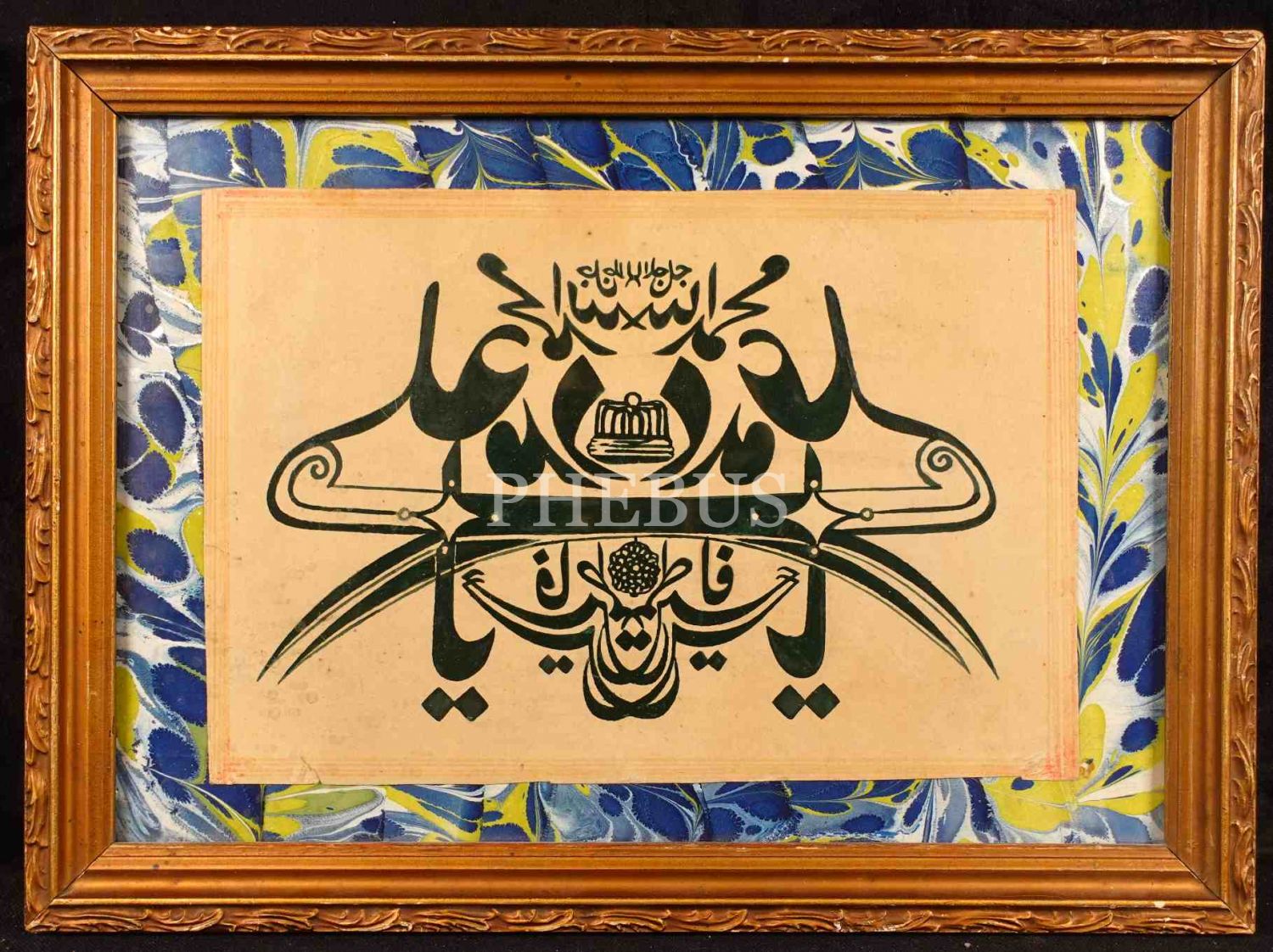 Ebru pervazlı müsennâ tekke yazısı: "Allah, Muhammed, Meded Yâ Ali, Fâtıma, Hasan, Hüseyin", 24x33 cm