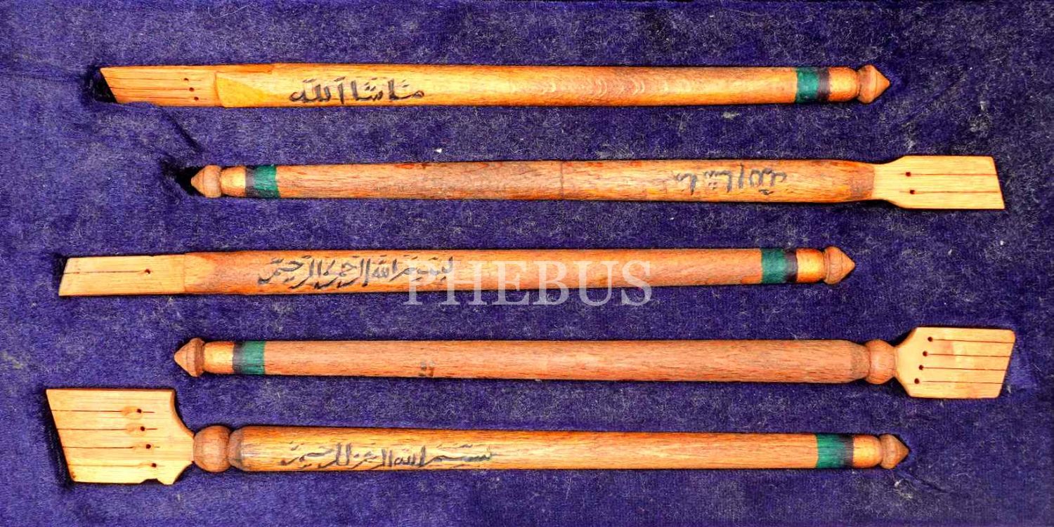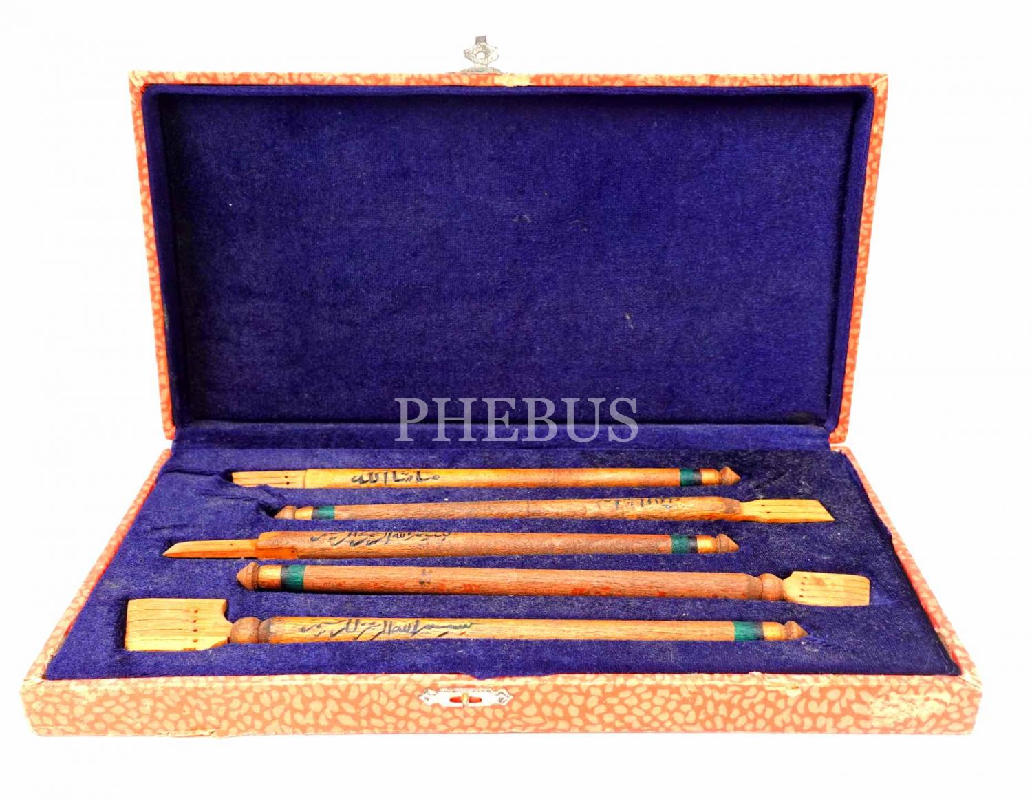 Özel kutusu içinde hattat kalem seti, 4 adet ahşap uçlu celî yazı kalemi, kutu: 14x28 cm