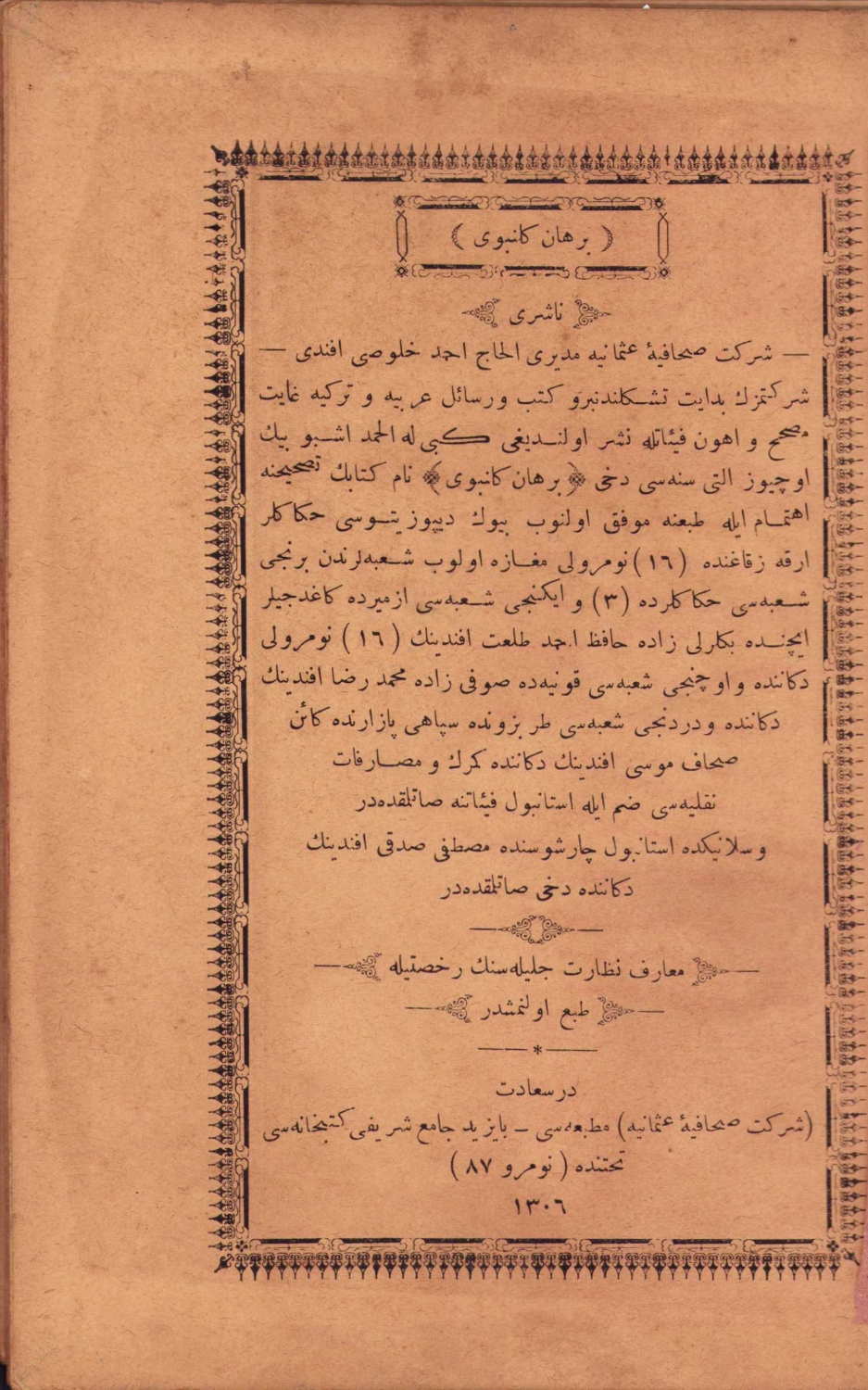Burhan-ı Gelenbevi, Sahafiye-i Osmaniye Matbaası, 1306, Arapça, cilt haliyle, sayfalarda kopuklu var, 103 sayfa, 16x23 cm
