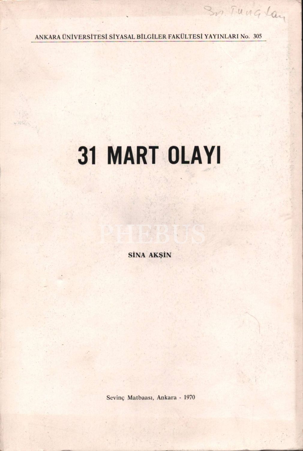 31 MART OLAYI, Sina Akşin, A. Ü. Siyasal Bilgiler Fakültesi Yayınları, 1970, 313 sayfa