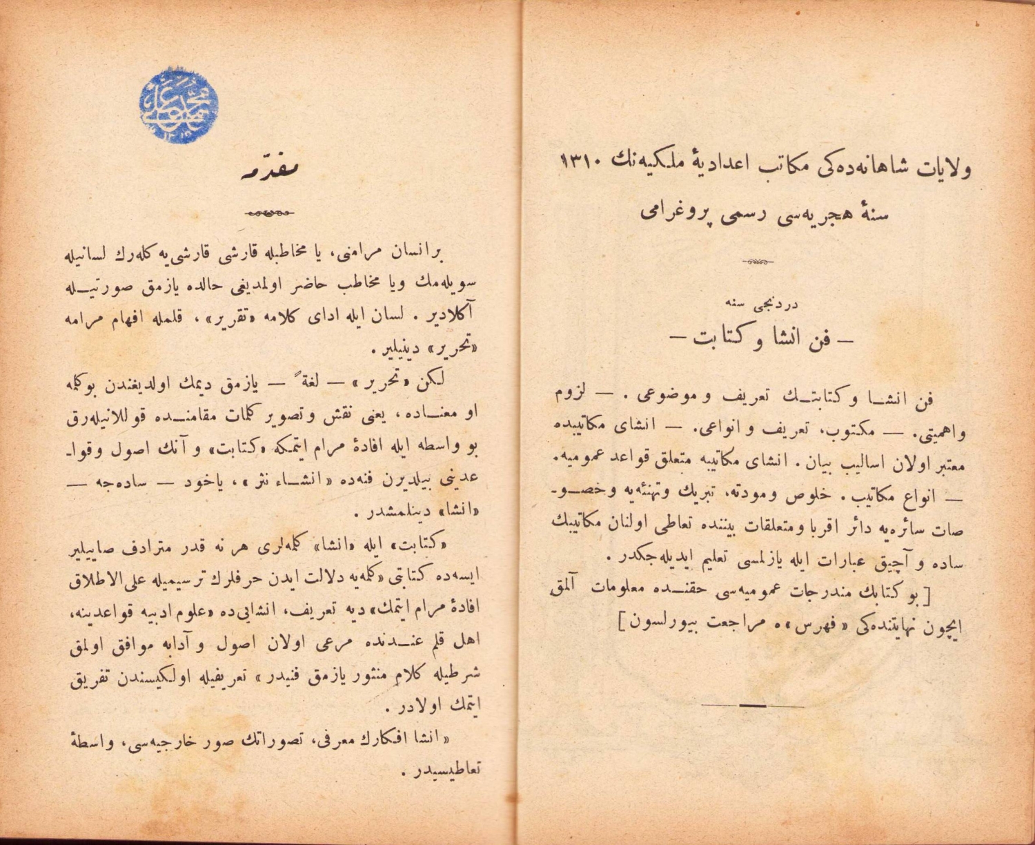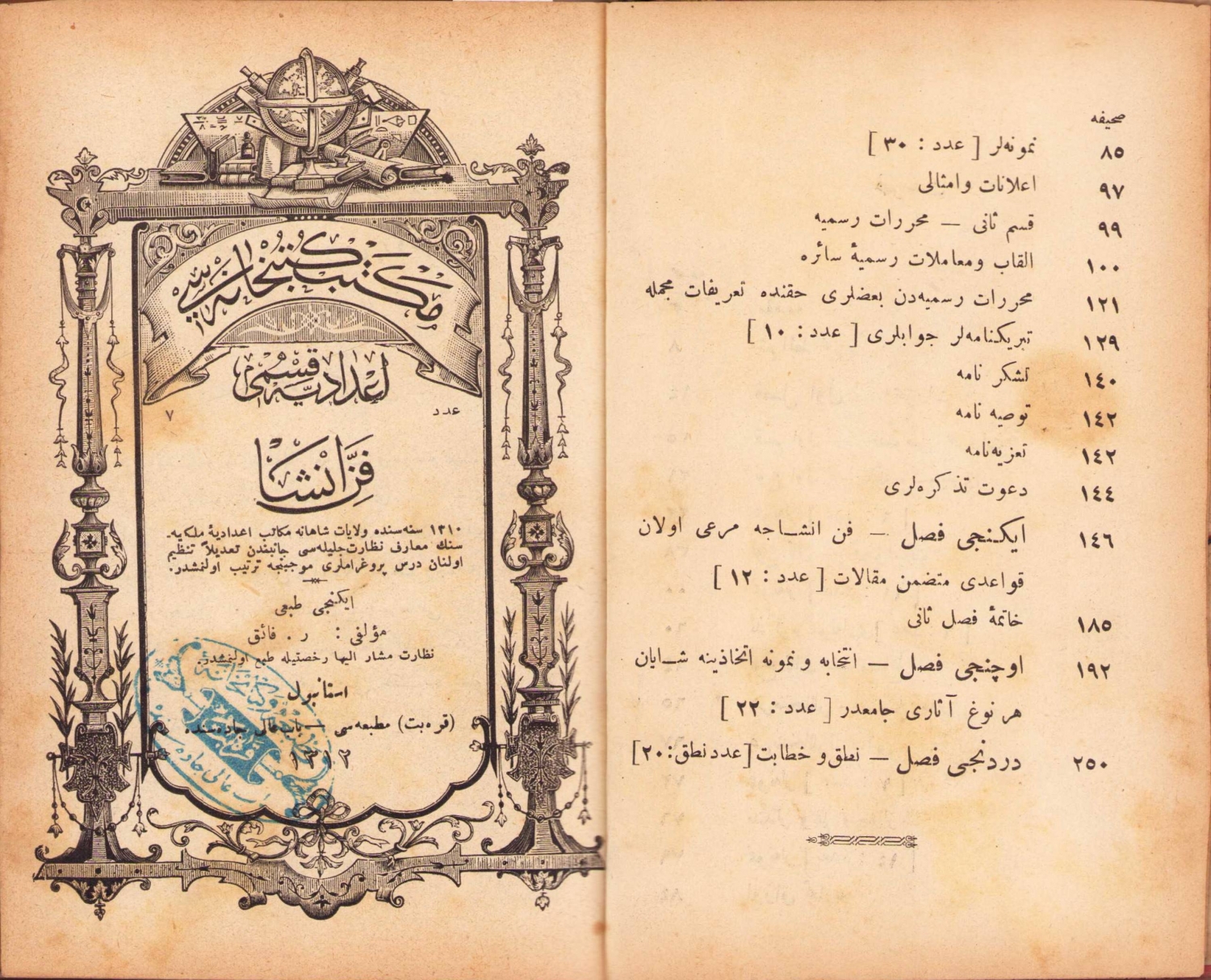 1. İdadi Kısmı Fenn-i İnşa:1310 (1894) Senesinde Vilayat-ı Şahane Mekatib-i İdadiye-i Mülkiyenin Maarif Nezareti Celilesi Canibinden Tadilen Tanzim Olunan Ders Programları Mucibince Tertib Olunmuştur, kinci baskı, Karabet Matbaası, İstanbul, 1312, Mektep Kütüphanesi Serisi, 380 sayfa.ÖZEGE; 5524.
