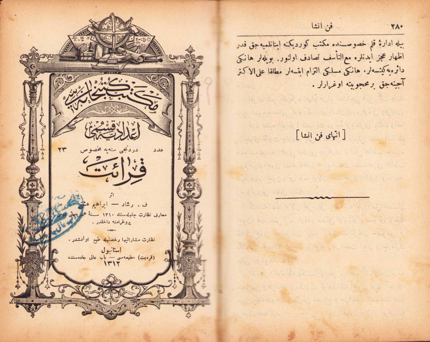 2. Kıraat İdadi Kısmı Dördüncü Sene, Faik Reşad - İbrahim Aşki, Karabet Matbaası, İstanbul, 1312, Mektep Kütüphanesi Serisi, 286 sayfa. ÖZEGE; 10563.
