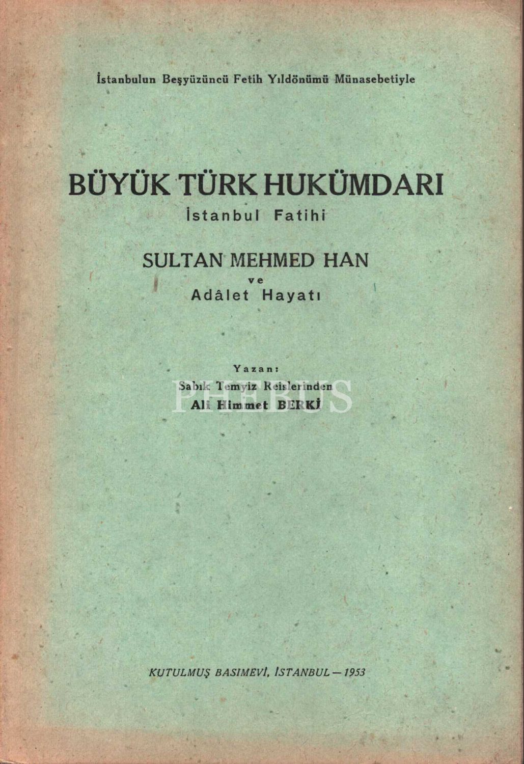 BÜYÜK TÜRK HÜKÜMDARI İSTANBUL FATİHİ SULTAN MEHMET HAN VE ADÂLET HAYATI, Ali Himmet Berki, Kutulmuş Basımevi, 1953, 155 sayfa