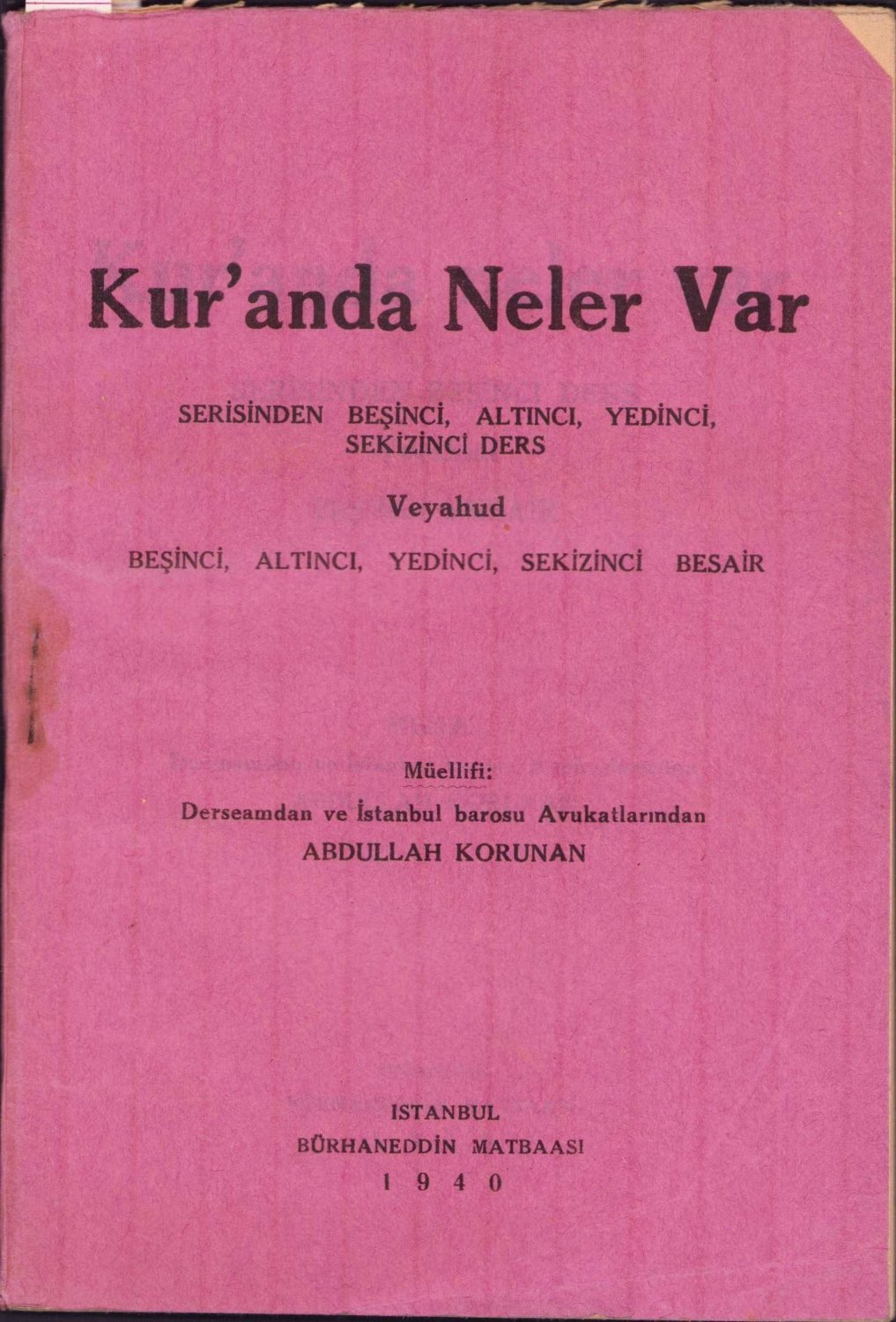 Kur'anda Neler Var - Serisinden beşinci, altıncı, yedinci, sekizinci der, Abdullah Korunan, Bürhaneddin Matbaası, İstanbul, 1940, 47 sayfa, 13x19 cm