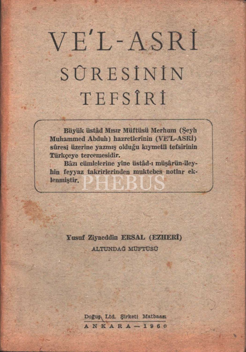 VE´L-ASRİ SÛRESİNİN TEFSİRİ, Yusuf Ziyaeddin Ersal, Doğuş Ltd. Şti. Matbaası, 1960, 63 sayfa