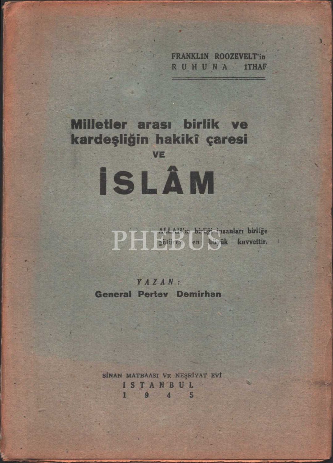 MİLLETLER ARASI BİRLİK VE KARDEŞLİĞİN HAKİKİ ÇARESİ VE İSLÂM, General Pertev Demirhan, Sinan Matbaası ve Basımevi, 1945, 38 sayfa