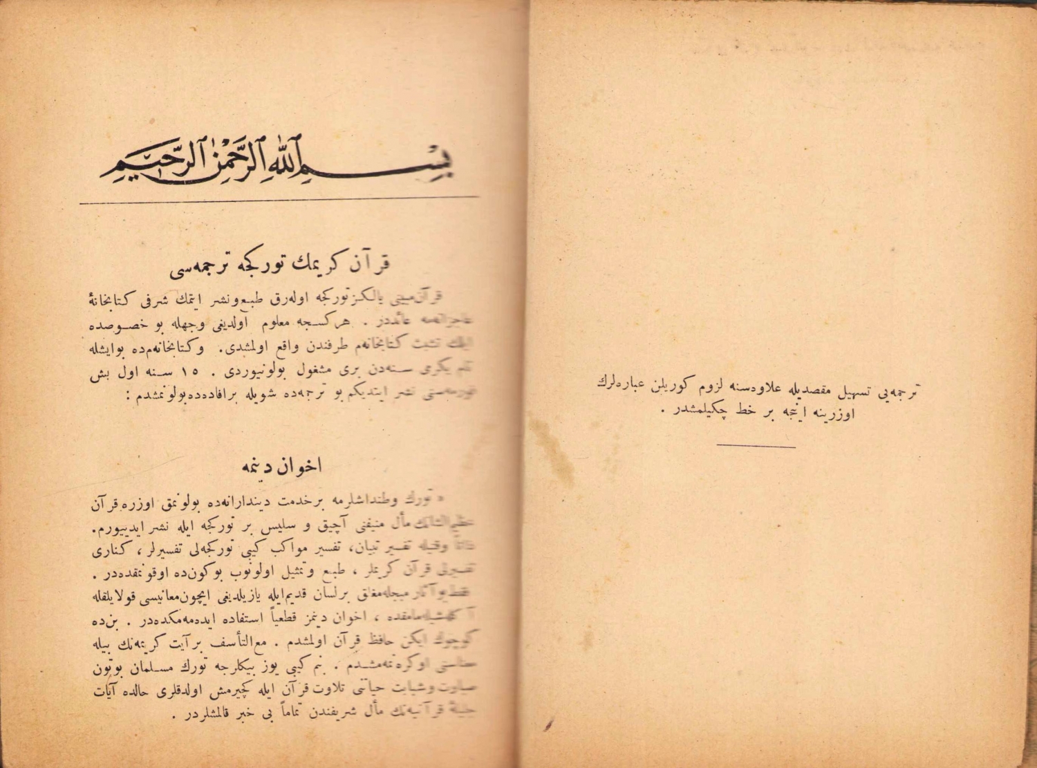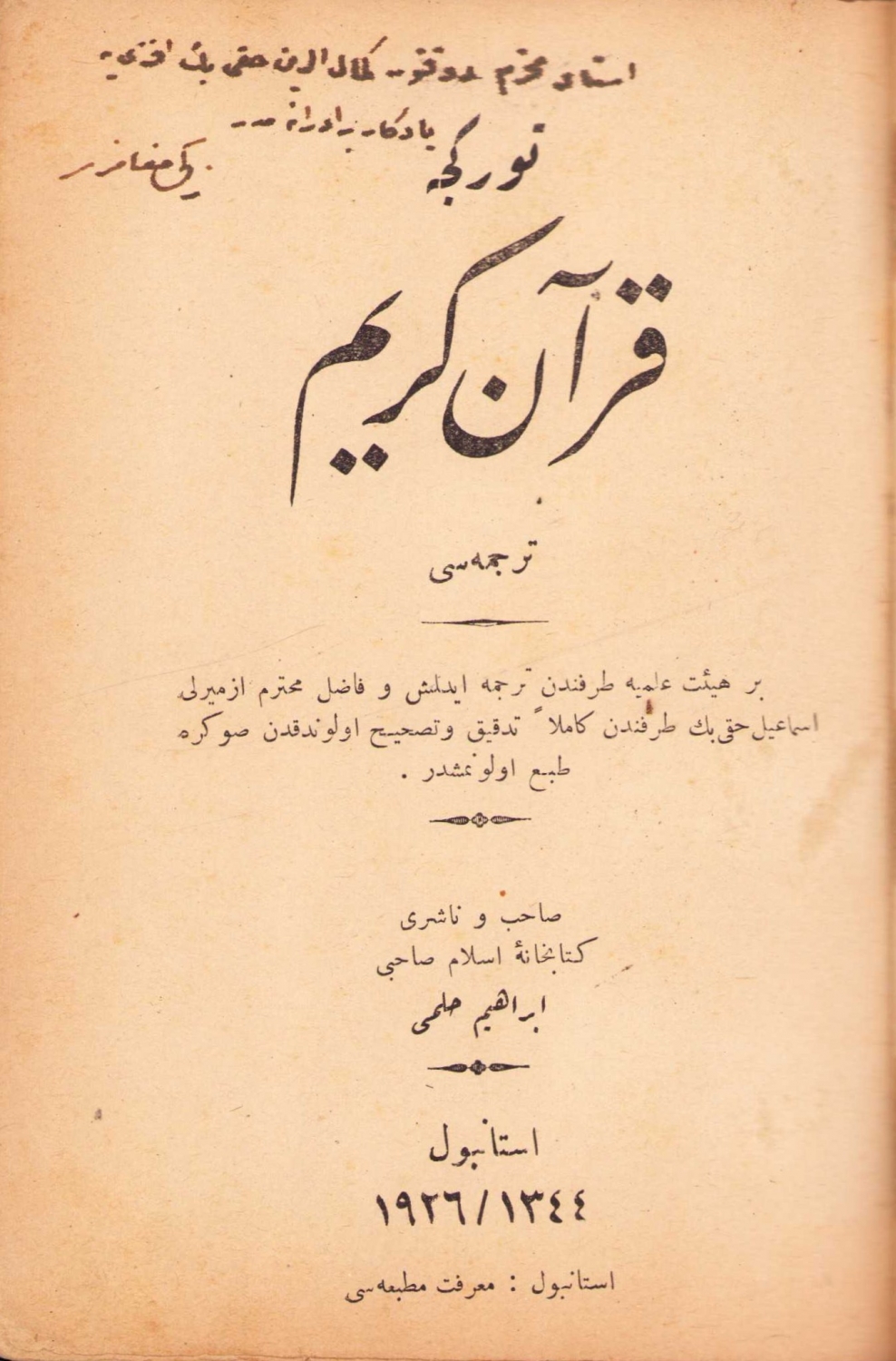 Türkçe Kura-ı Kerim Tercümesi, Marifet Matbaası, İstanbul,1344, İzmirli İsmail Hakkı Bey tarafından tedkik edilmiştir, 944 sayfa, 12x17 cm